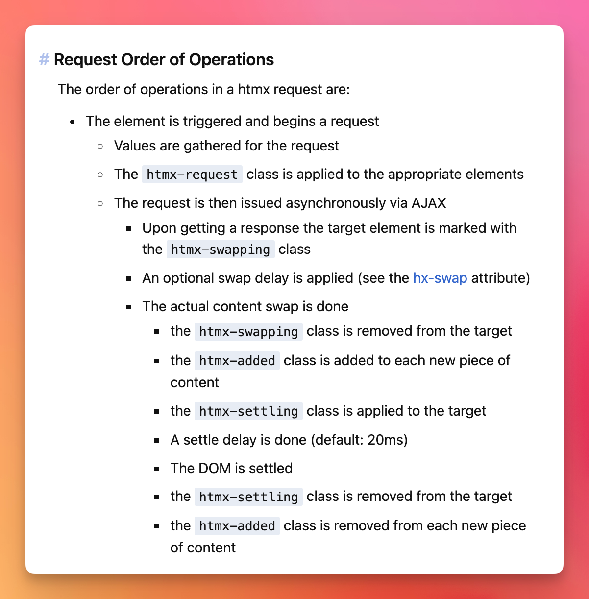 The request lifecycle goes through a set of stages: settling, request, swapping, added (see https://htmx.org/docs/#request-operations)