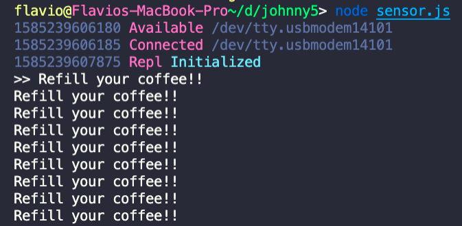 If I start running out of coffee, the program will print “Refill your coffee!!” a lot of times, because the value keeps changing while the sensor gets drier.