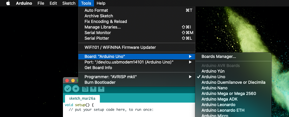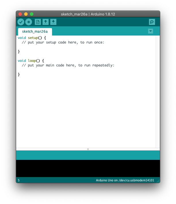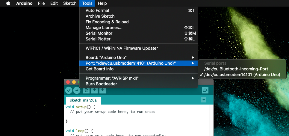 Go to Tools -> Port and make sure the port selected is the one the Arduino is connected to (in my case /dev/cu.usbmodem14101). You should have a few options, and Arduino IDE should already pre-detect it for you.