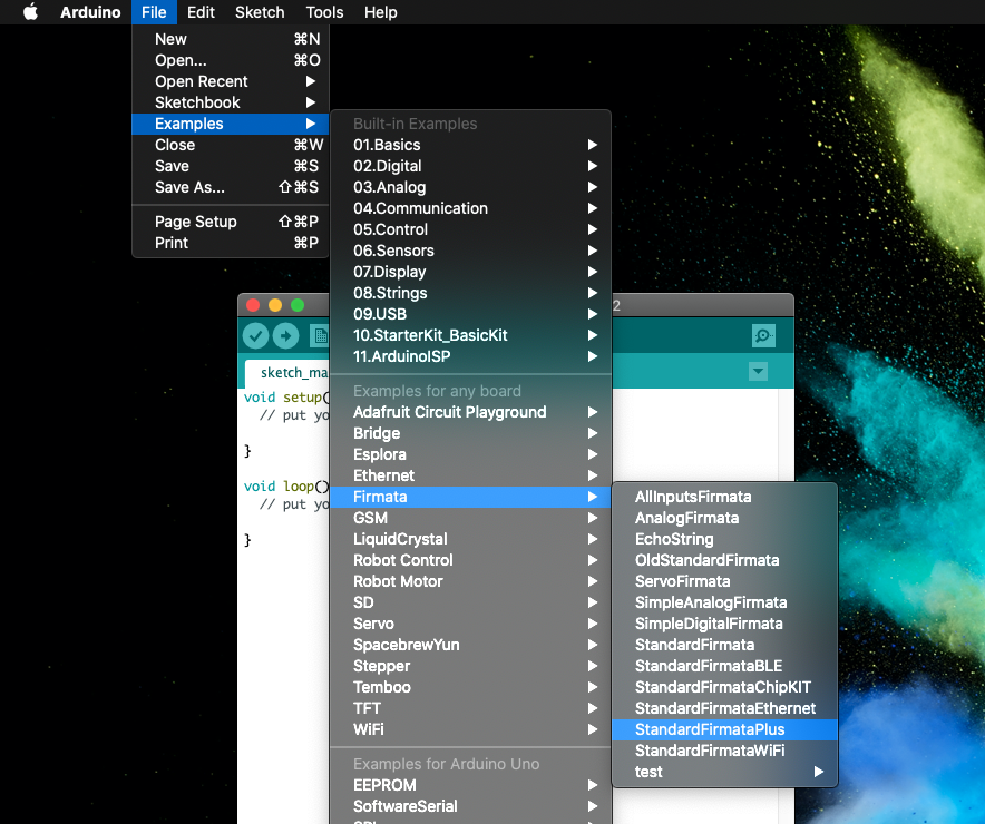 Then go to File -> Examples -> Firmata and choose StandardFirmataPlus: