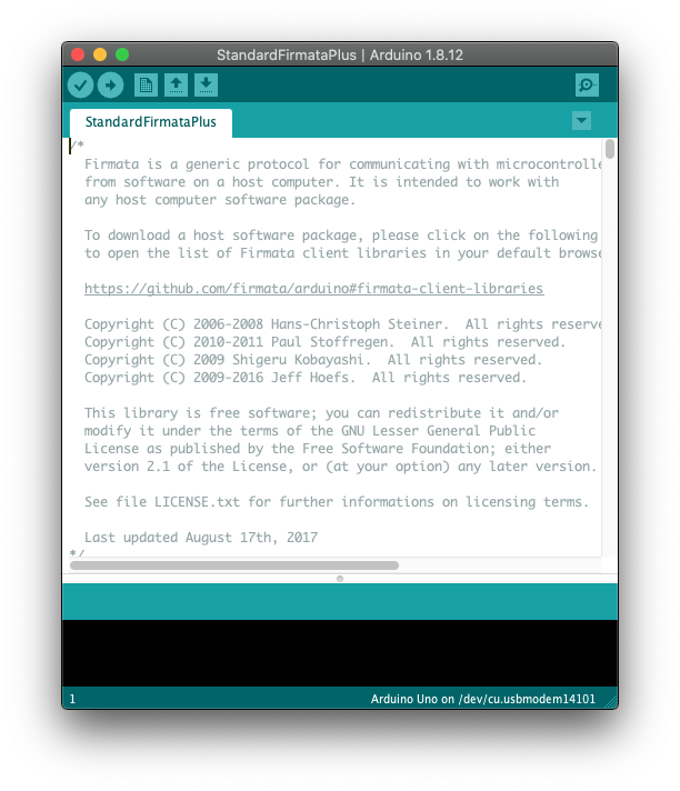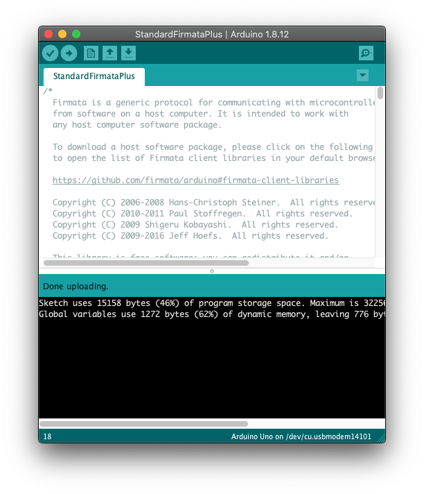 The program loaded in memory now is the StandardFirmataPlus program, that provides Johnny Five a set of primitives, an API implemented through the Firmata protocol, that we can call programmatically through the USB connection.