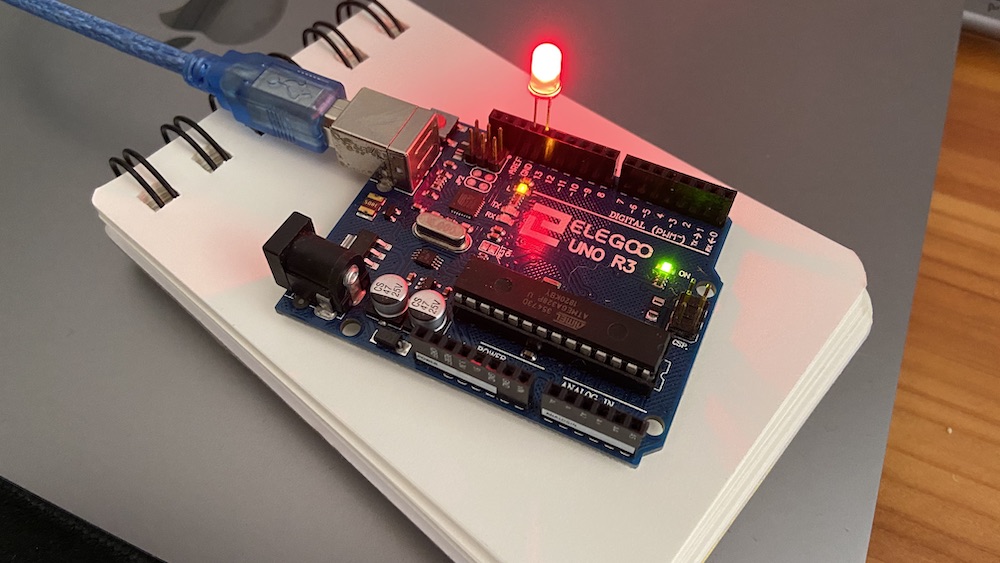 You can also attach a real LED by connecting the negative pin to GND (0V) and the positive pin to the pin 13: