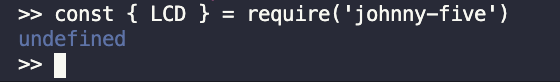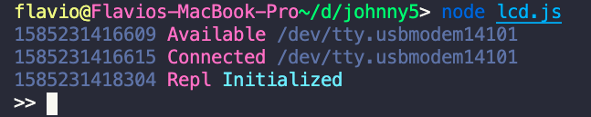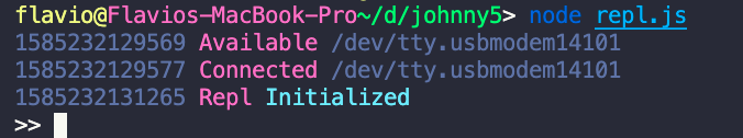 When you run a program using Johnny Five, you can see that in the terminal, we have access to a REPL, a term that means Read-Evaluate-Print-Loop.