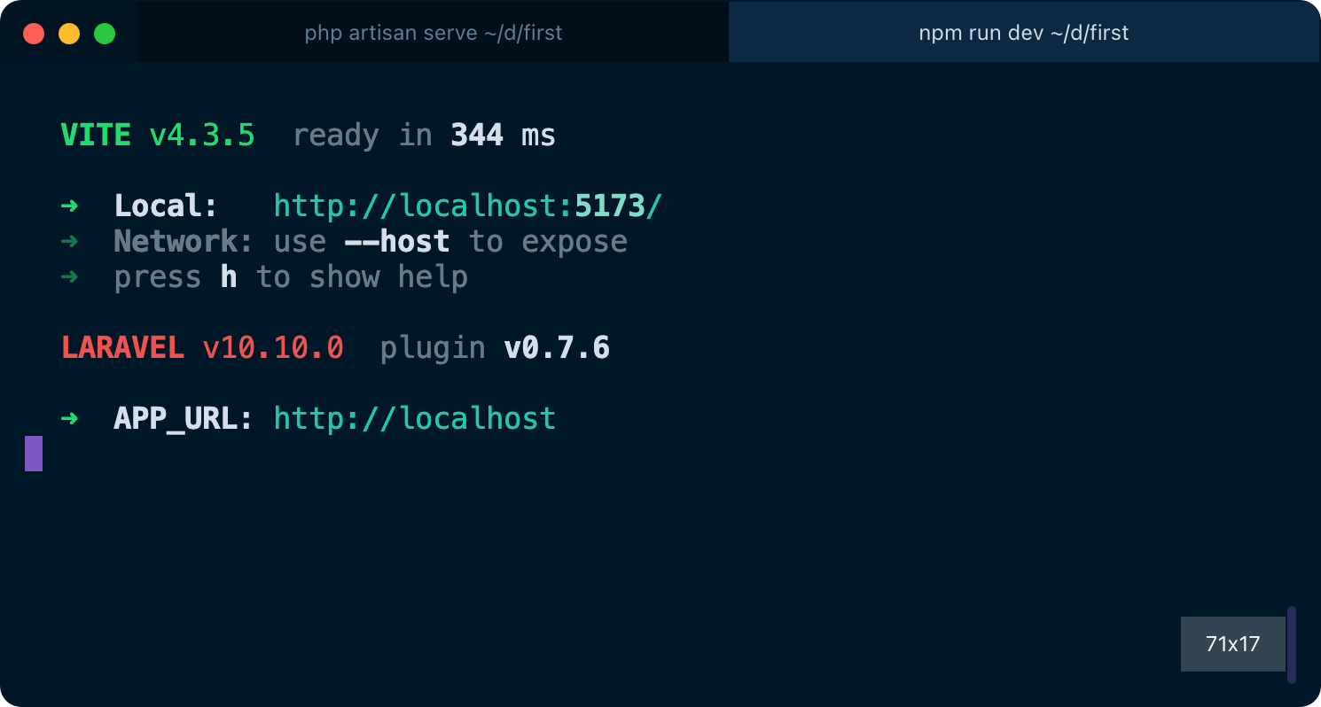 Finally, back to the terminal, run npm run dev and keep it running while developing the site, as php artisan serve (run both in 2 different terminal windows).