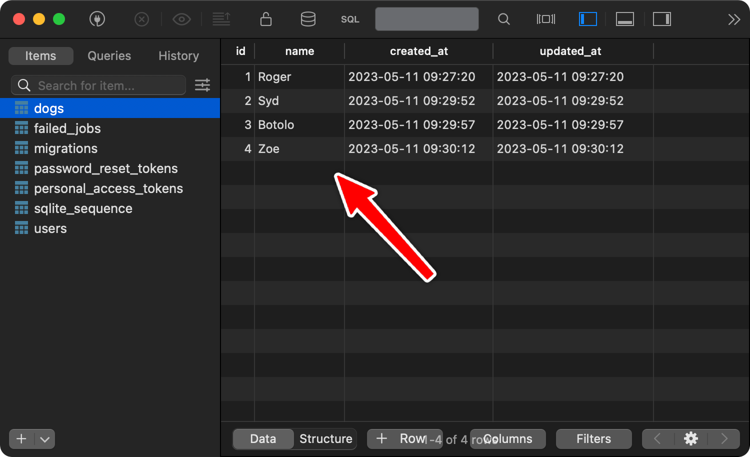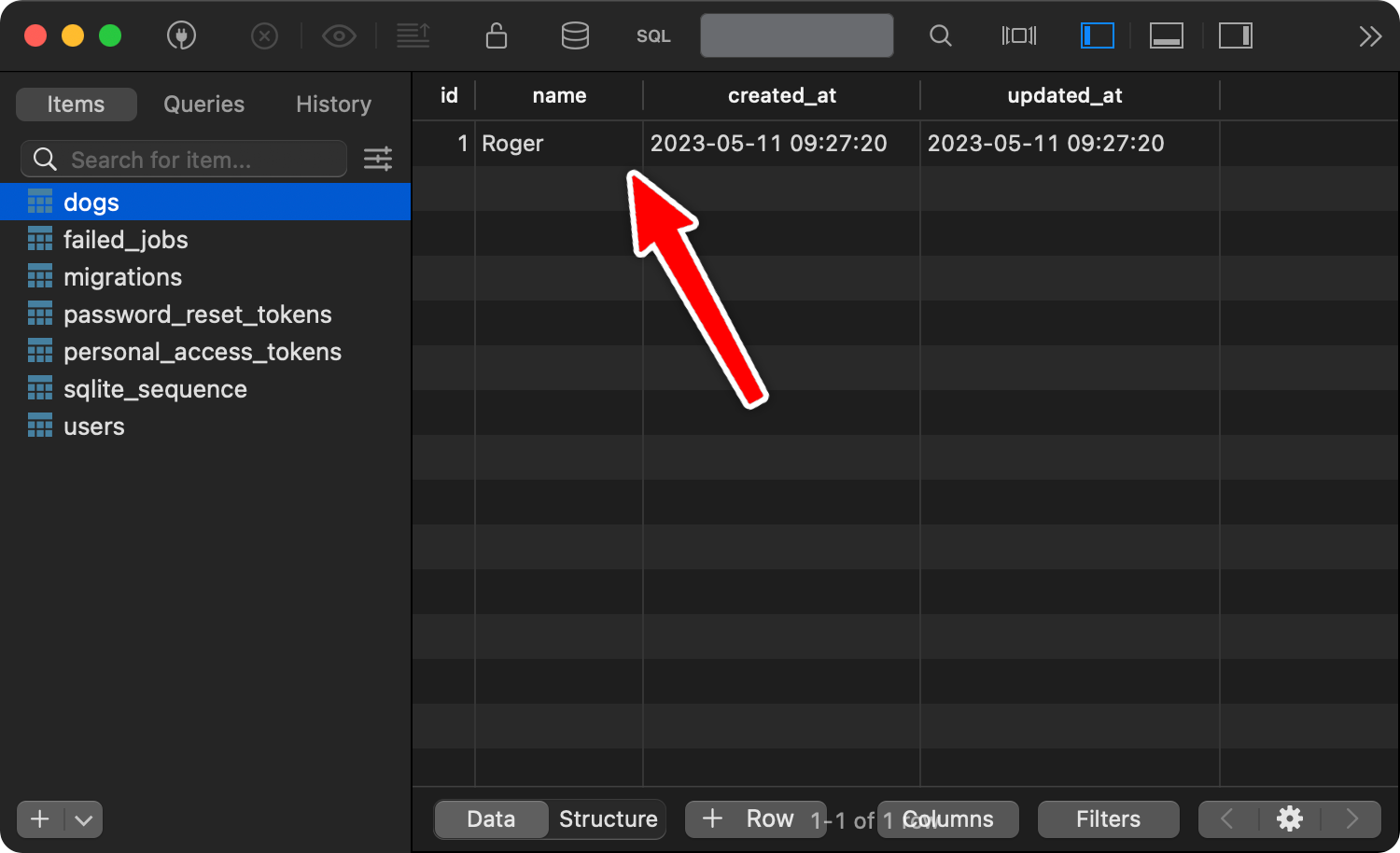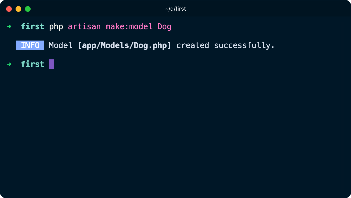 The model has a corresponding table, which we do not mention, but it’s the dogs table we created beforehand because of the naming convention dogs table → Dog model.