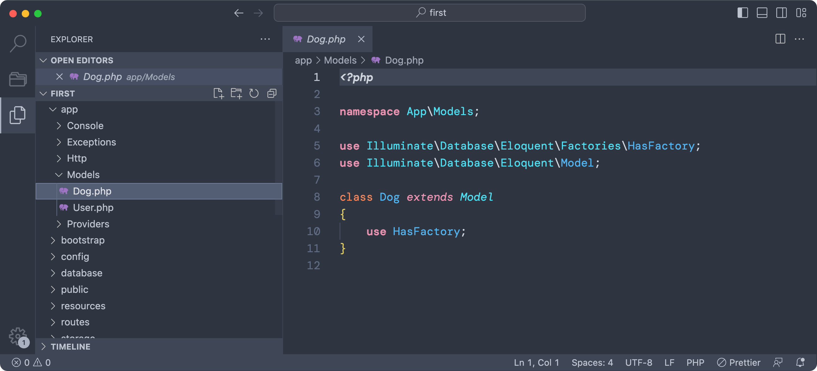 Laravel adds a DogController.php file into the folder app/Http/Controllers/