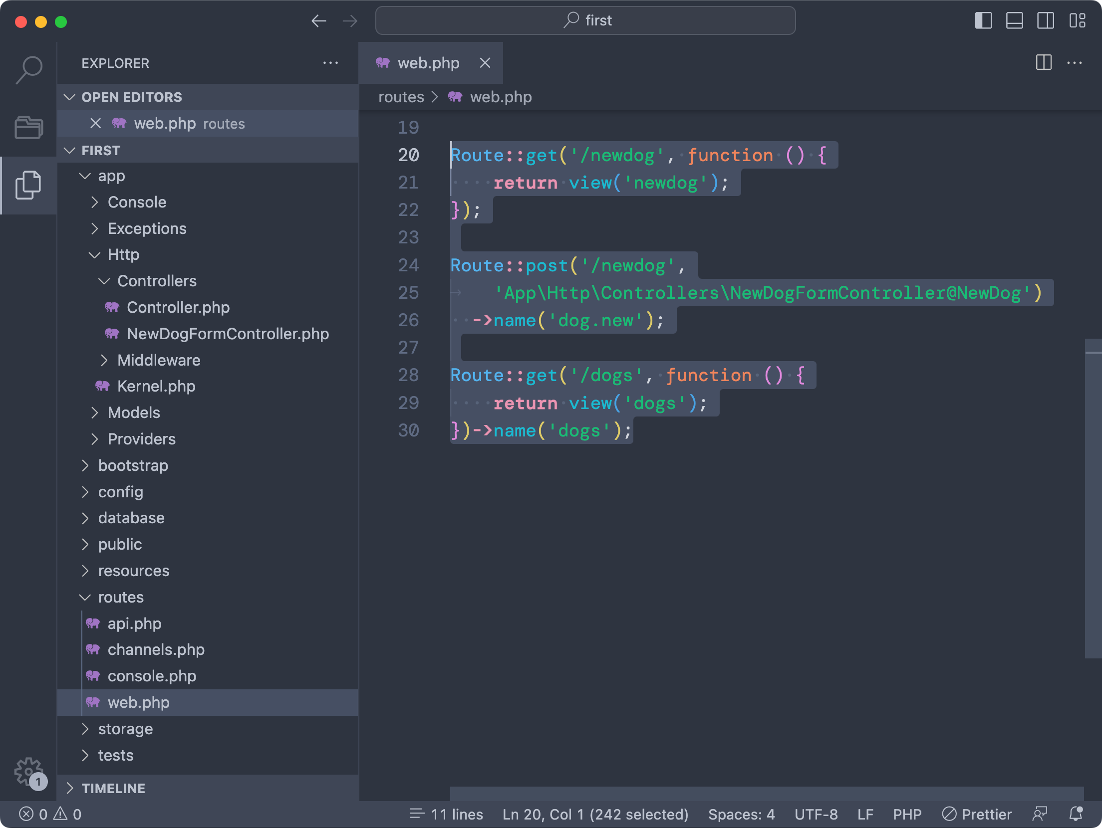 Before doing so, in routes/web.php we add the POST /dogs route handle controller and we assign it the name dog.create