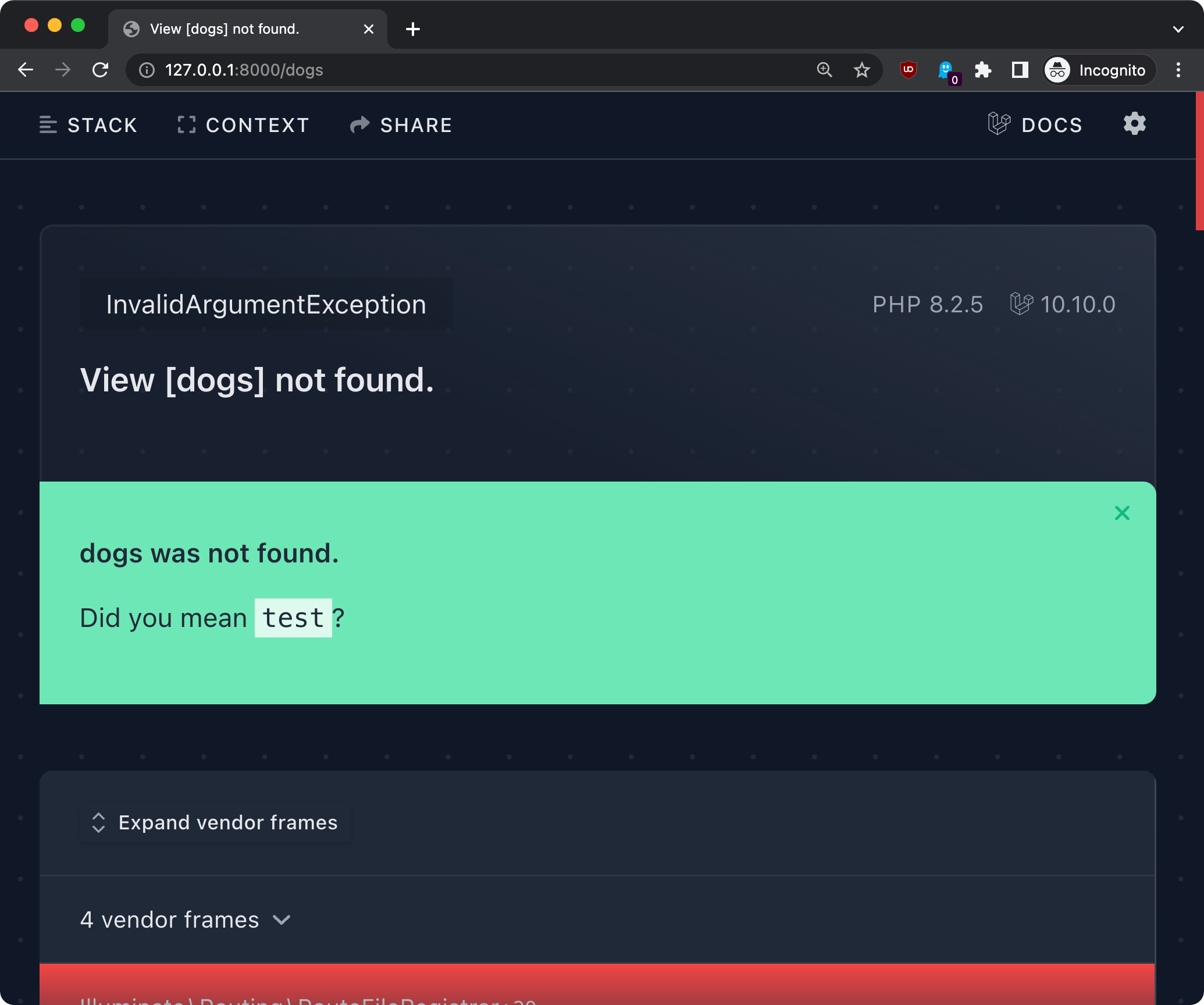 In the browser there’s an error now but don’t worry - it’s because we haven’t added a dogs view yet.