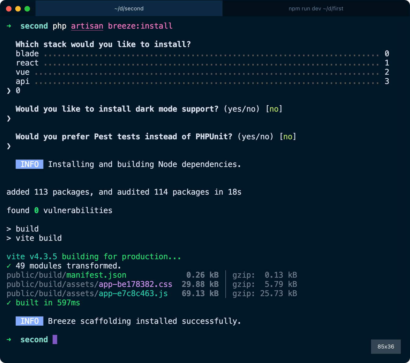 and pick option 0, “blade”, and pick the default options for the other questions artisan asks you:
