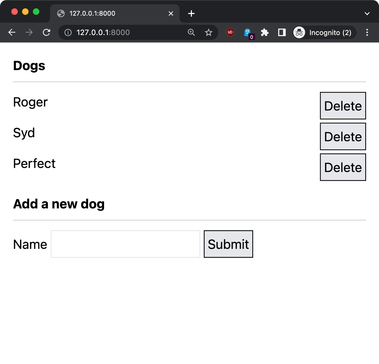 We use Flexbox to align the dog name and the delete button. Adding the flex-1 class makes the text take all the space available, and “pushes” the button to the far right.