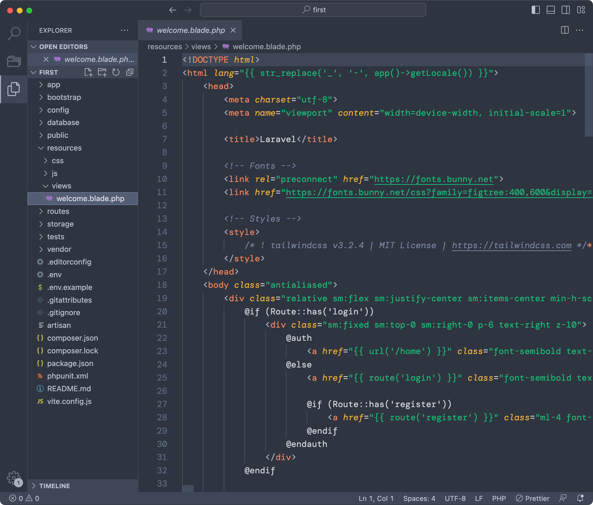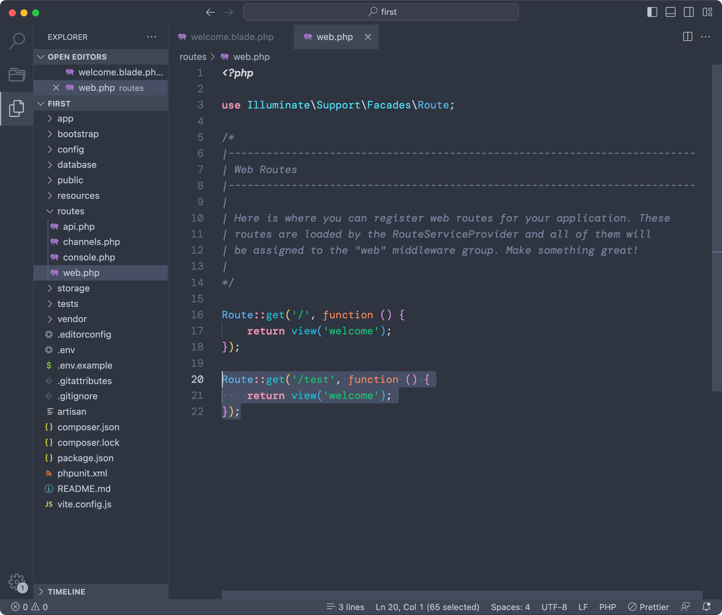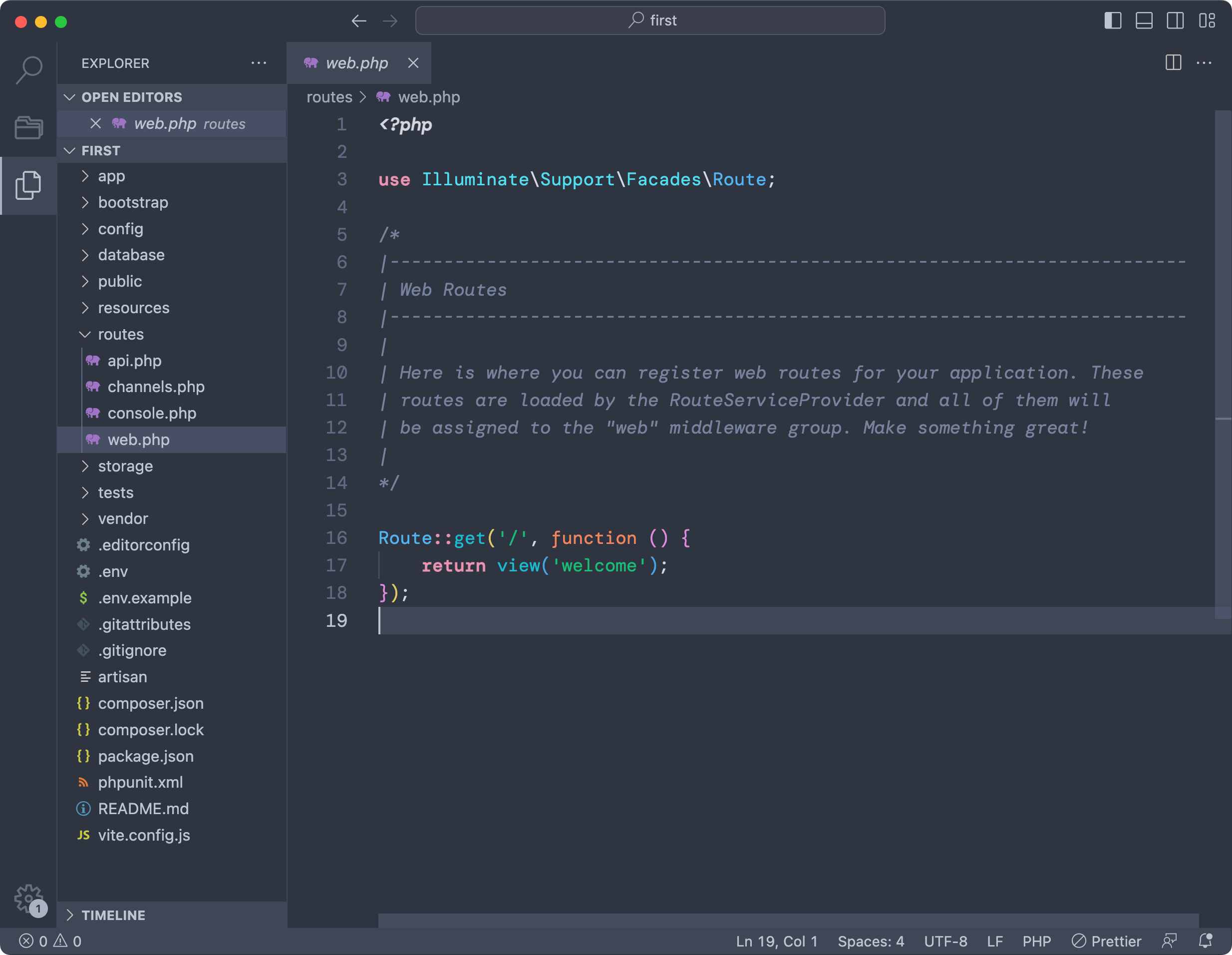 In this file, as shown in the screenshot, we tell Laravel to return the welcome view when someone visits the / URL using the GET HTTP method (the one used when you open the page in the browser):