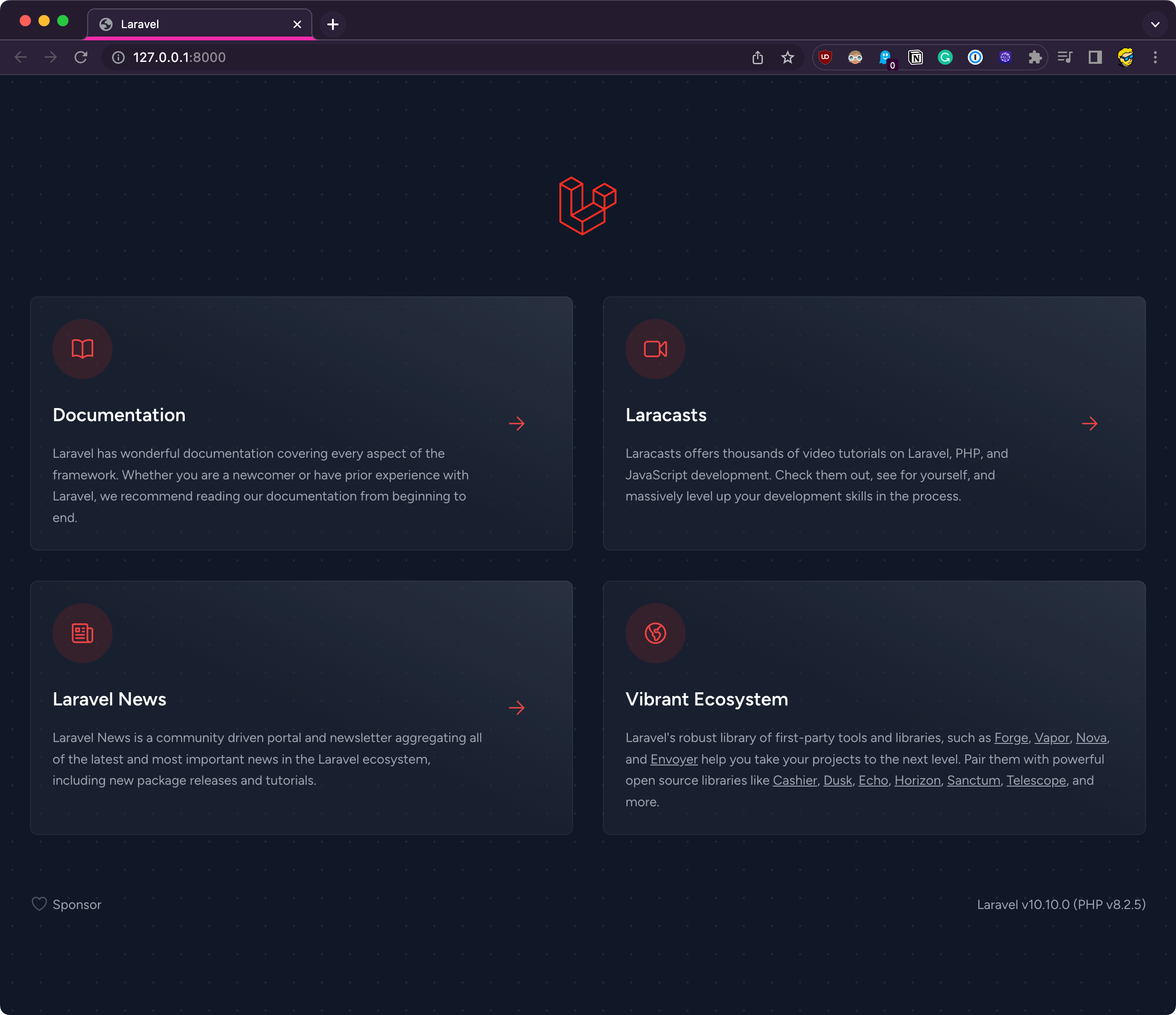 Open your browser and you’ll see the default welcome screen of a Laravel app: