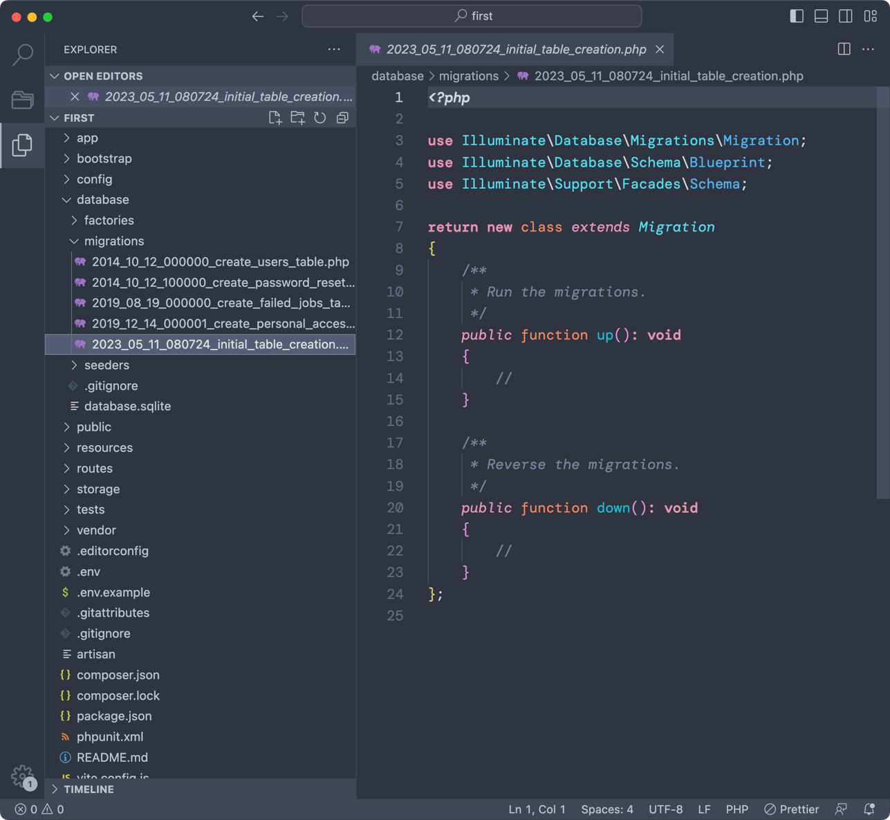This command created the 2023_05_11_080724_initial_table_creation.php file (the date and time will of course change for you) in the database/migrations folder.