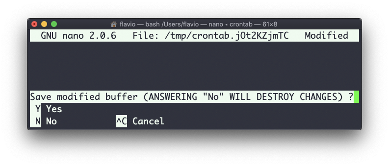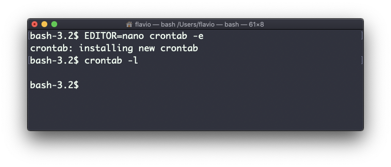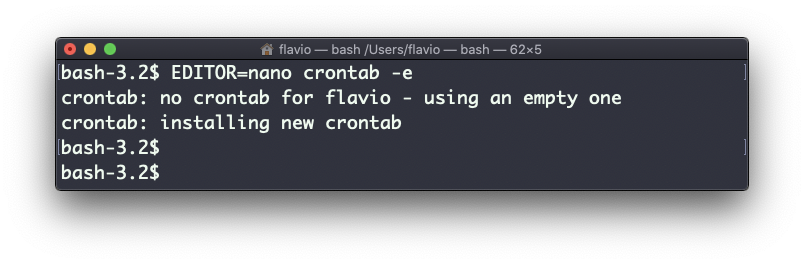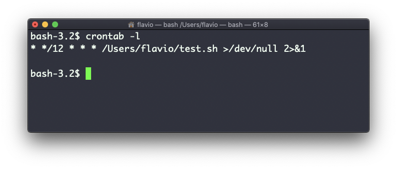 I chose to run a script located in /Users/flavio/test.sh every 12 hours. This is the crontab line I need to run: