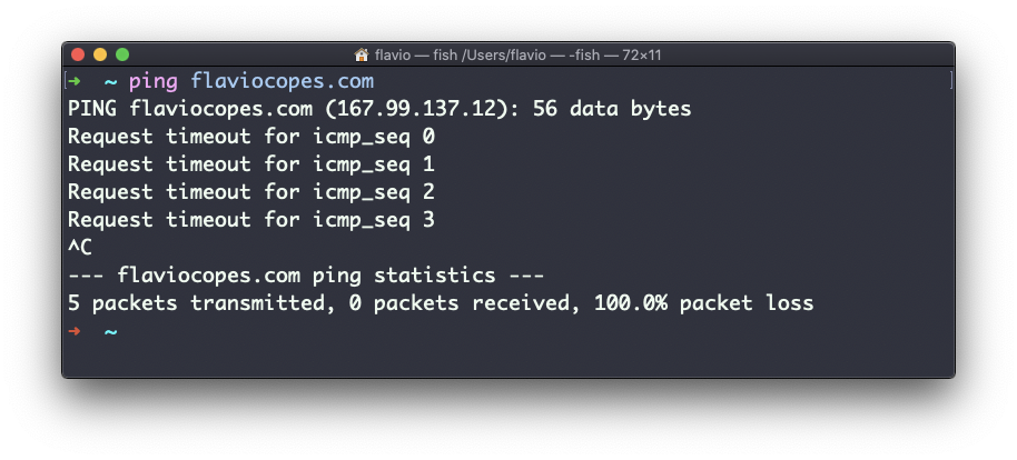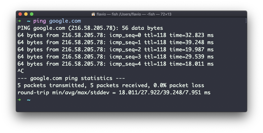 Once ping is stopped, it will print some statistics about the results: the percentage of packages lost, and statistics about the network performance.