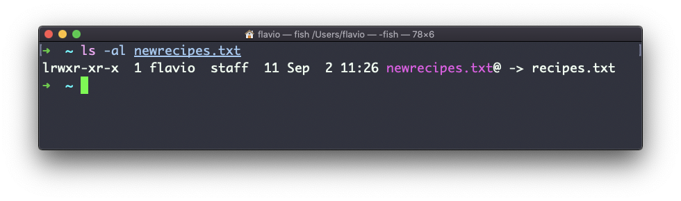 In this case you can see there’s a special l flag when you list the file using ls -al, and the file name has a @ at the end, and it’s colored differently if you have colors enabled: