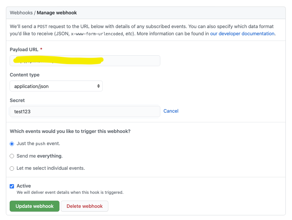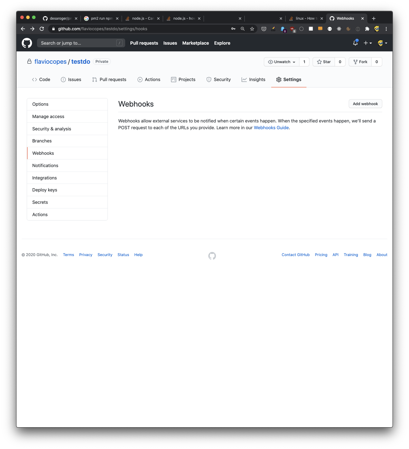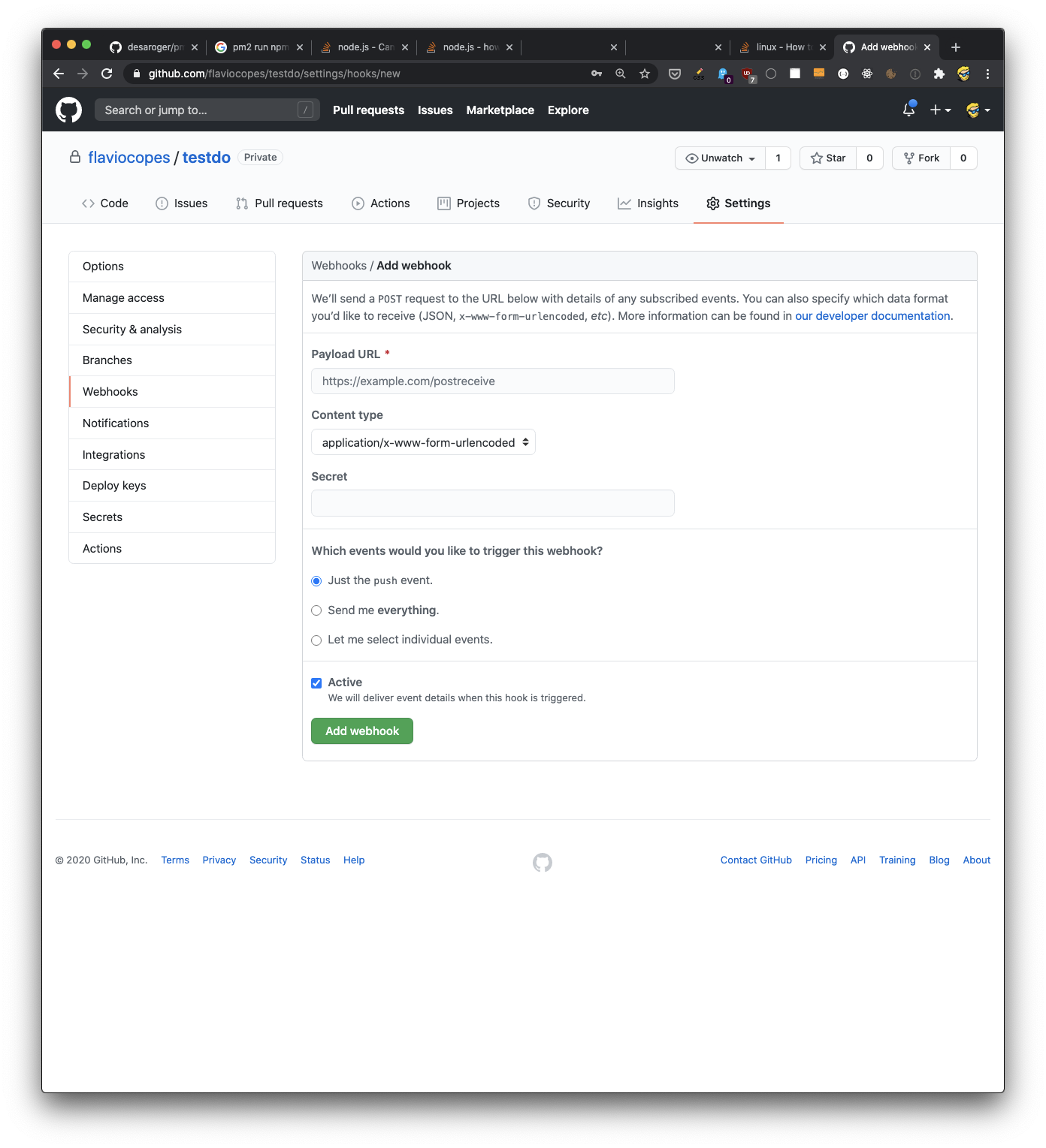 Now open the repository settings on GitHub, and in the Webhooks section click Add Webhook.