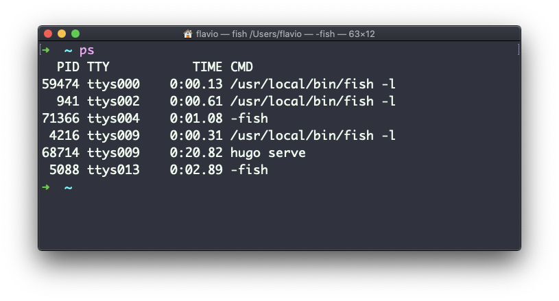 Here I have a few fish shell instances, mostly opened by VS Code inside the editor, and an instances of Hugo running the development preview of a site.