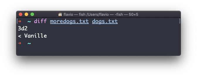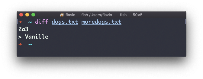 diff dogs.txt moredogs.txt will tell you the second file has one more line, line 3 with the line Vanille: