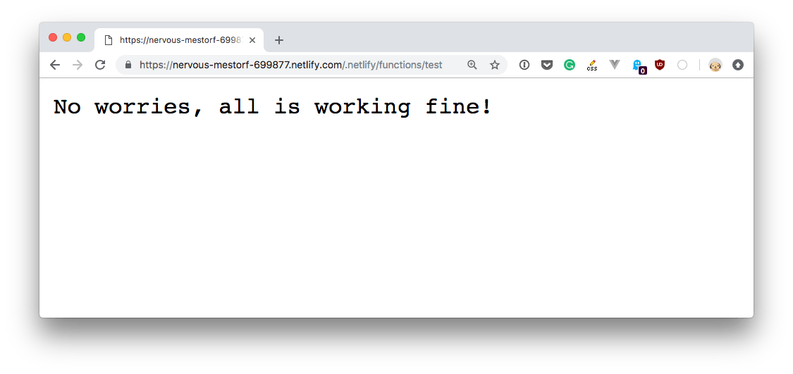 The function, which was stored in the functions/test.js file, is accessible at https://YOURSITENAME.netlify.com/.netlify/functions/test.
