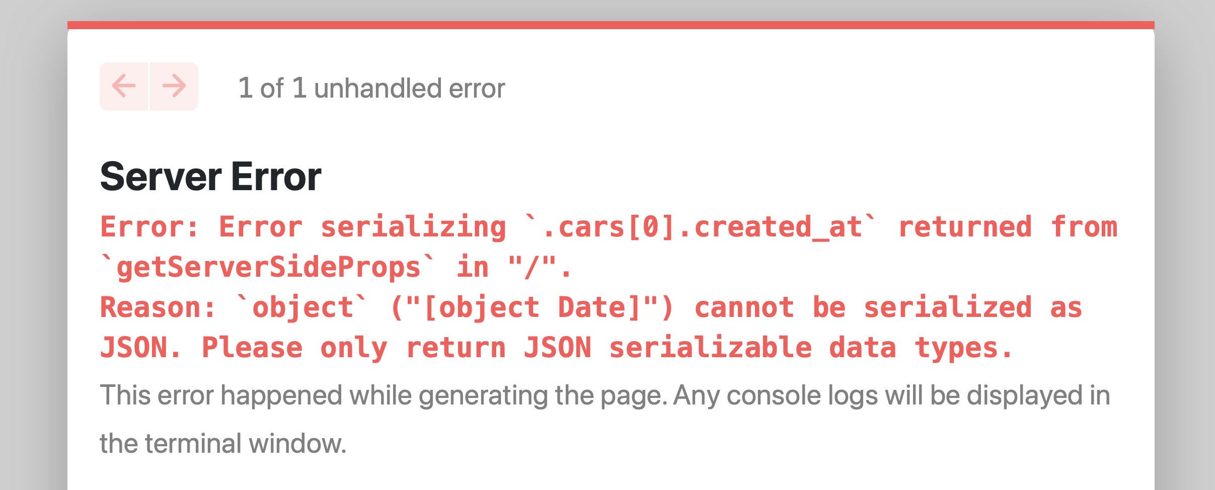 Now if the database table has a field that contains a date, that’s converted to a Date object in JavaScript and you’ll get an error like this: