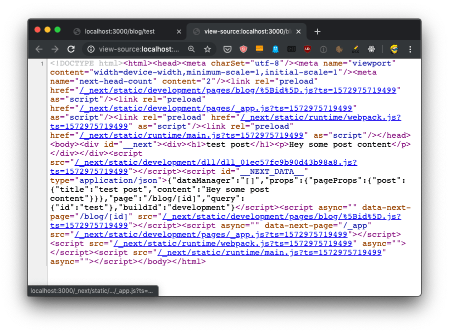 which in the case of calling http://localhost:3000/blog/test will respectively result to: