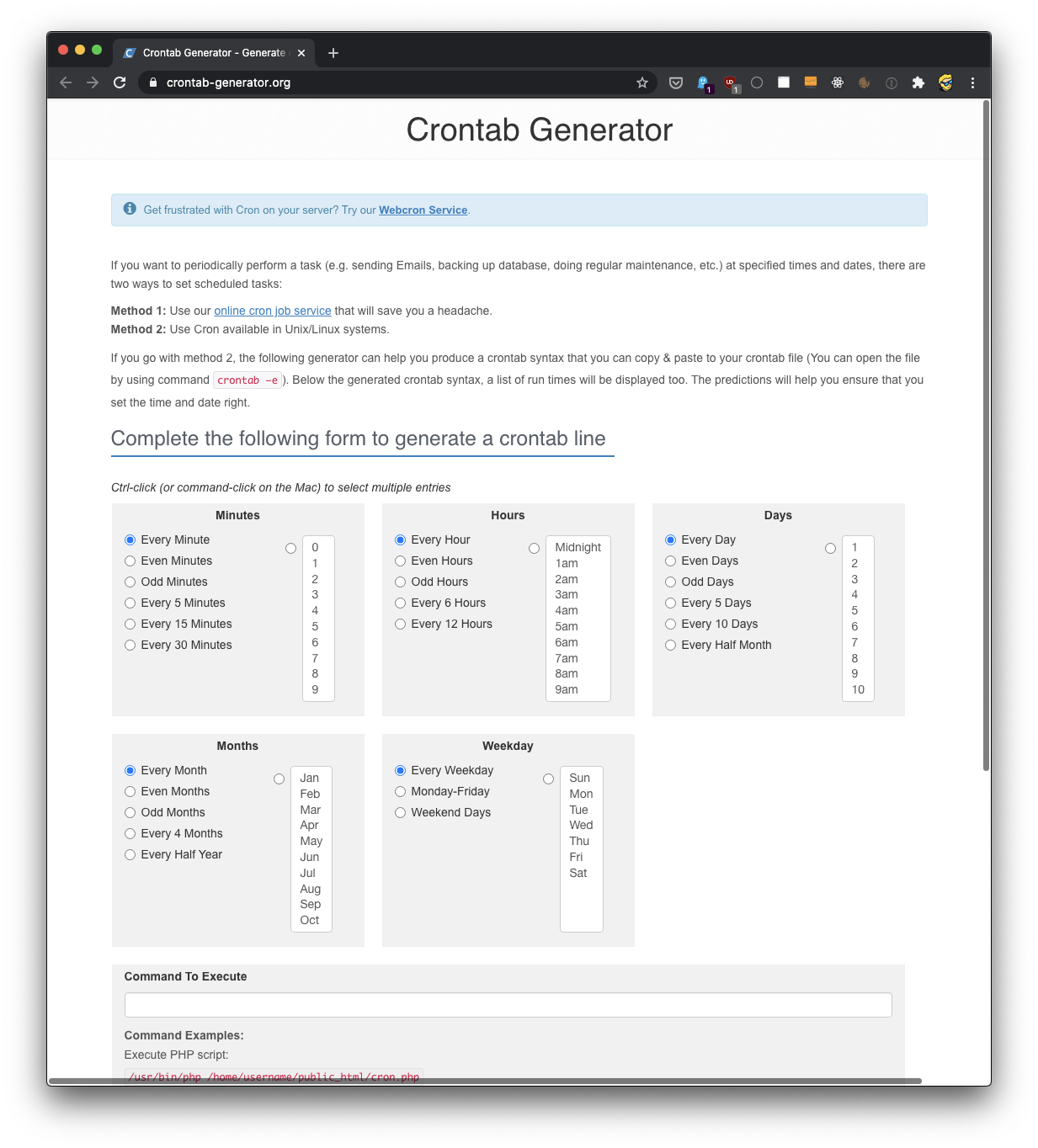 The syntax to define cron jobs is kind of scary. This is why I usually use a website to help me generate it without errors: https://crontab-generator.org/