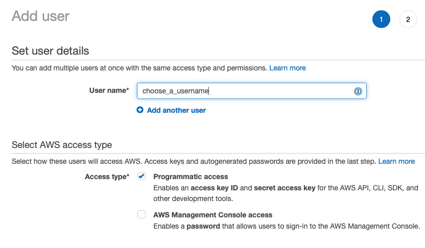 Once the user is created, you’ll have a pair of access key ID and secret access key. Copy those to your .env file in the project you have, or store them somewhere so you can use them later.
