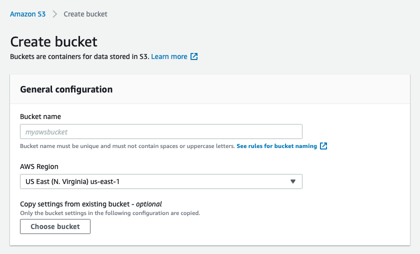 Next, go in S3 and create a bucket. From the S3 homepage https://s3.console.aws.amazon.com click the “Create bucket” button.