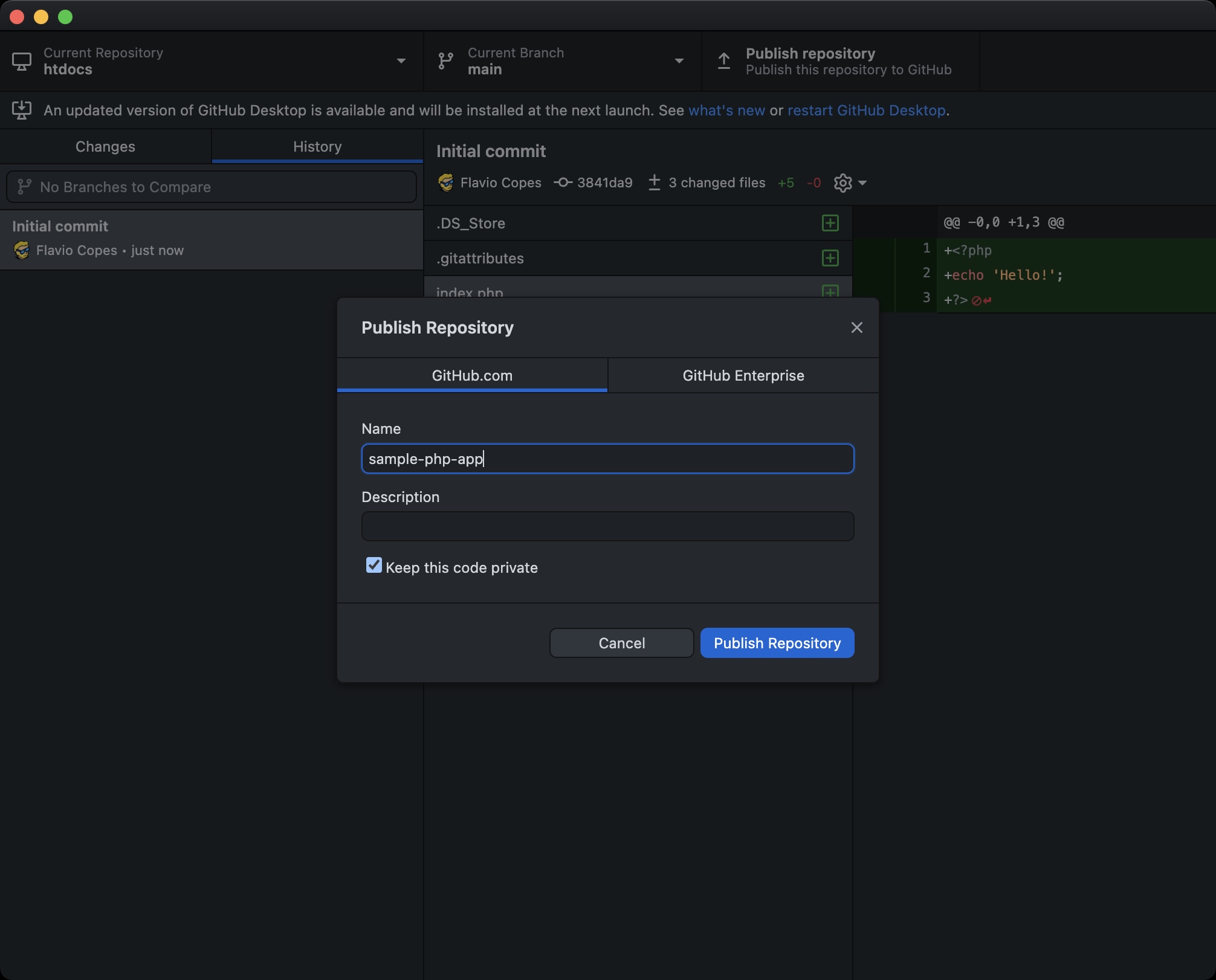 I add the parent folder to my GitHub Desktop app, I initialize a Git repo and I push it to GitHub: