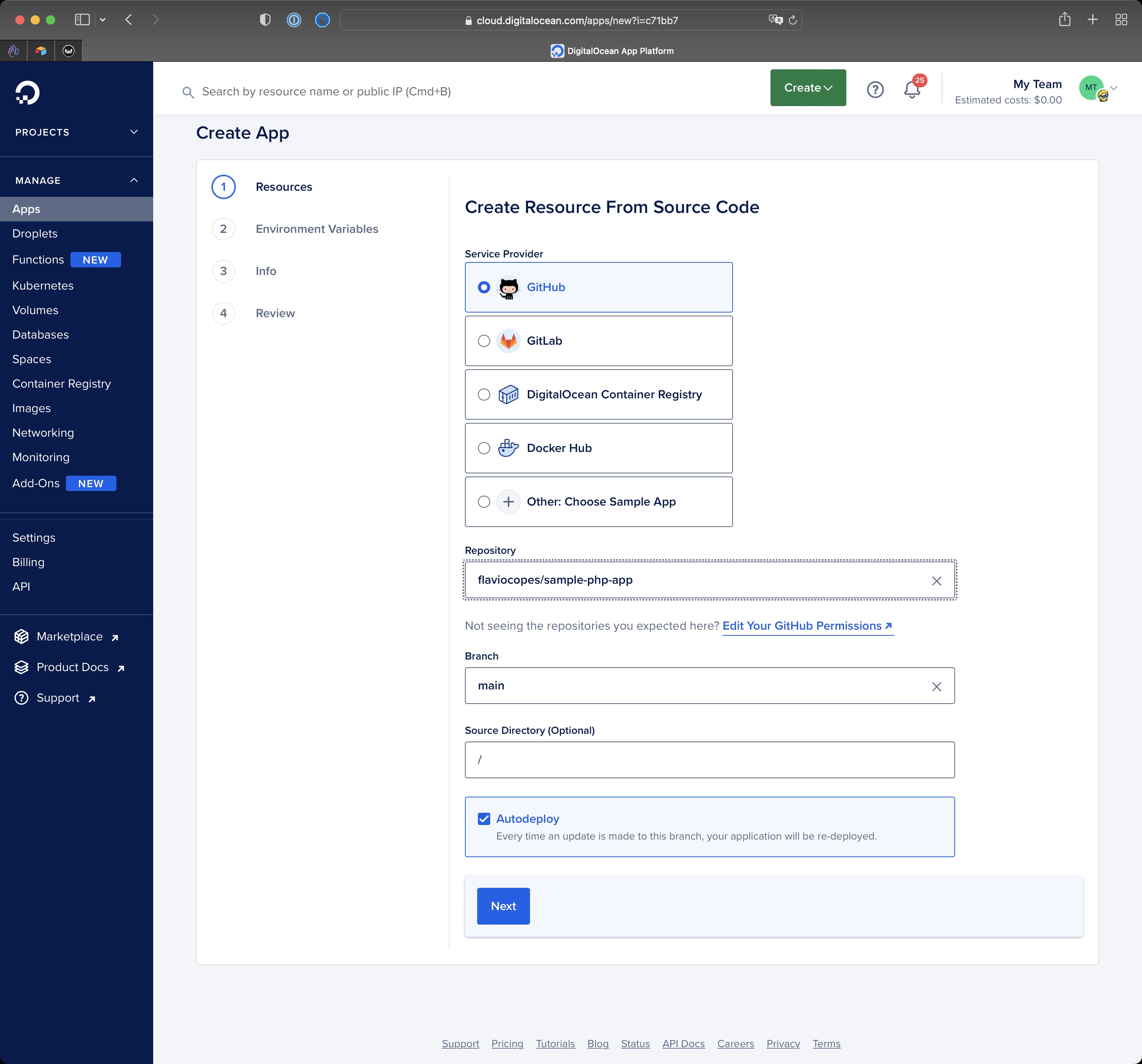 I connect my GitHub Account and select the repo of my app.