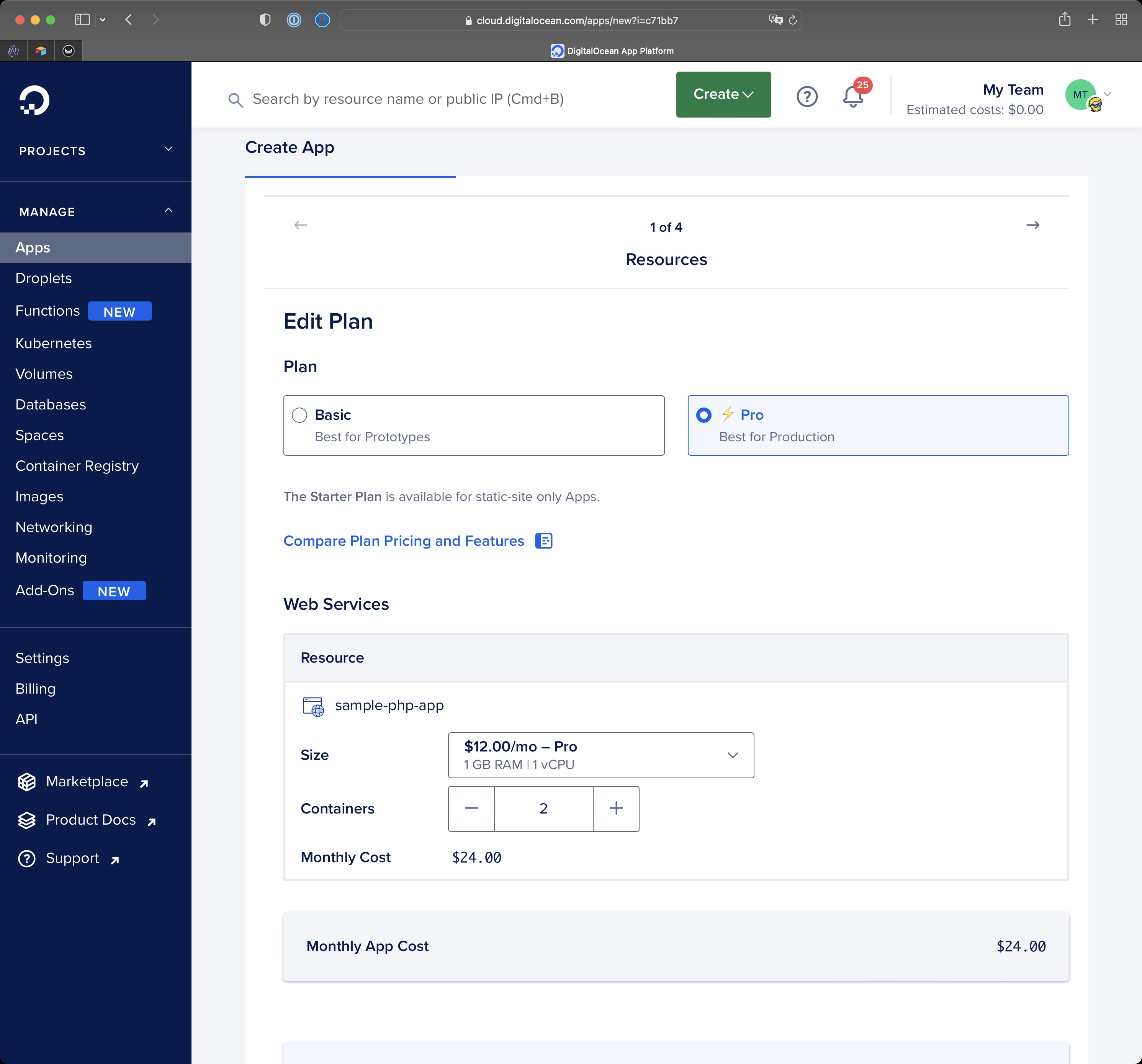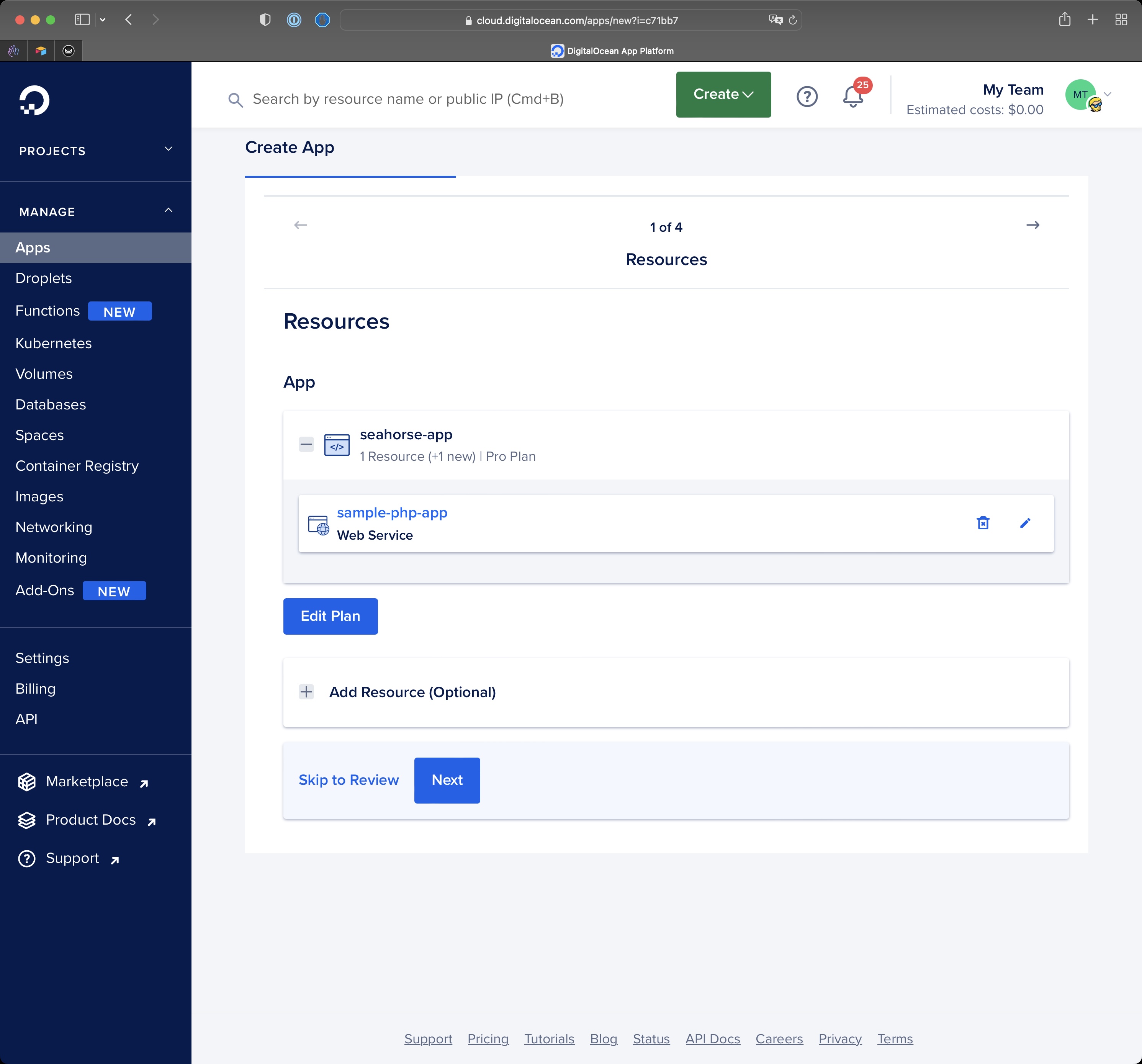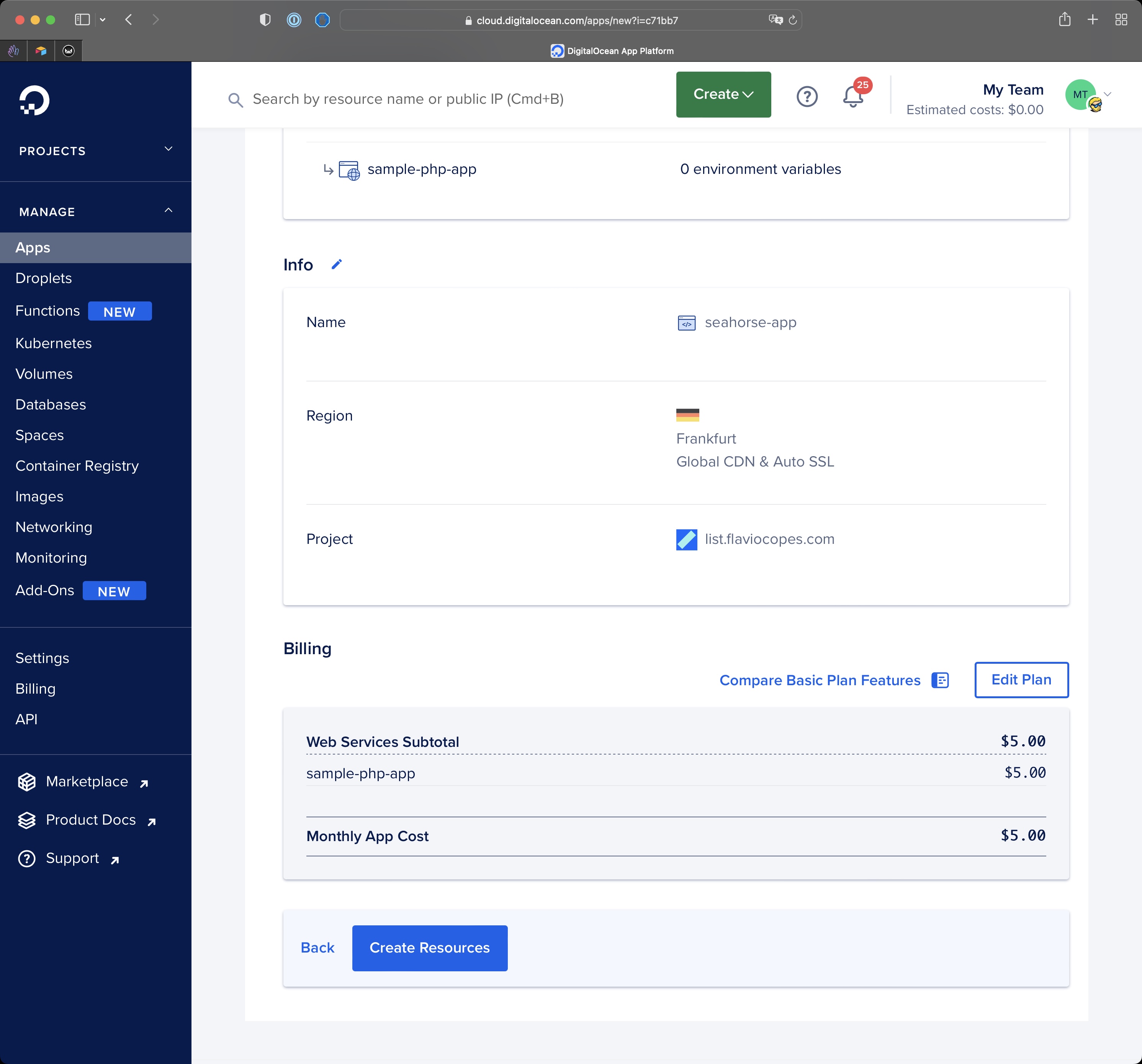 Then go back and press “Next” until the “Create Resources” button appears to create the app. You don’t need any database otherwise that would be another $7/m on top.