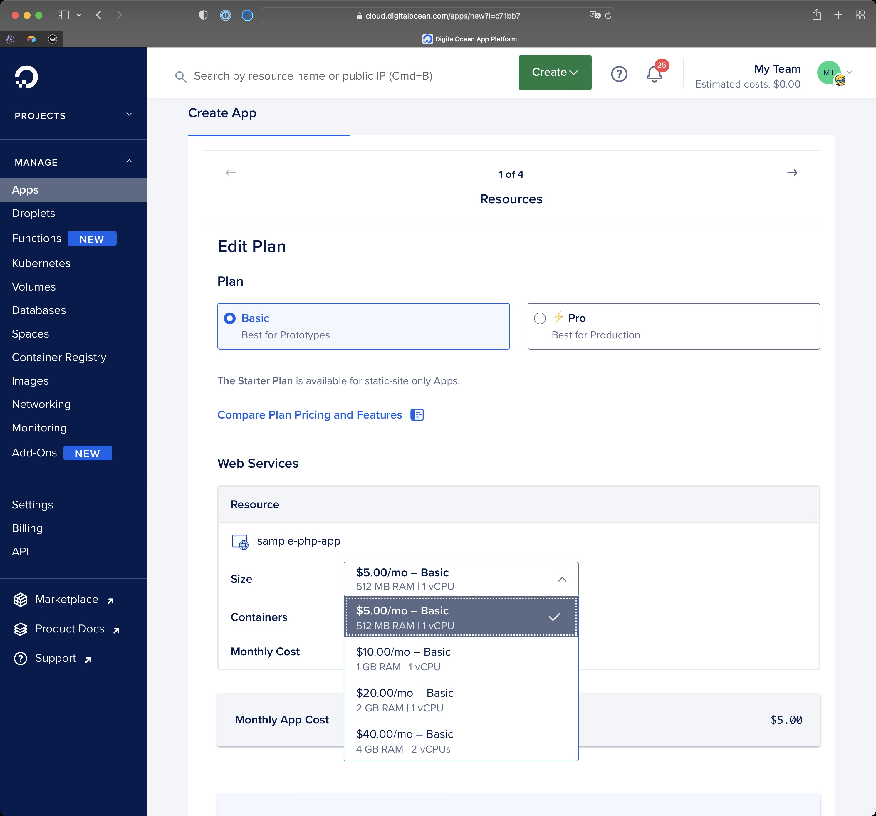 Use Basic and pick the $5/m plan.
