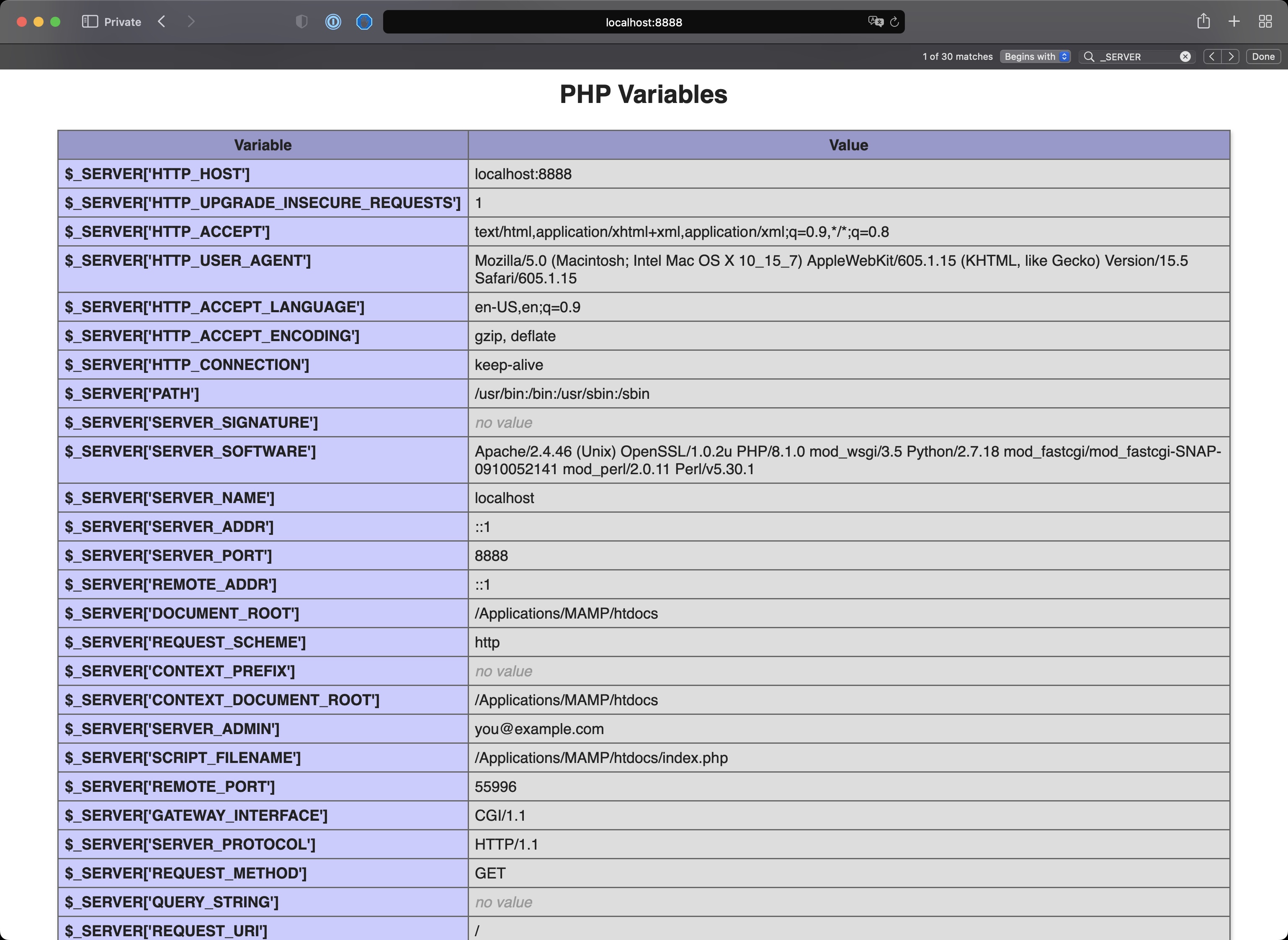 then generate the page at localhost:8888 and search $_SERVER, you will see all the configuration stored and the values assigned: