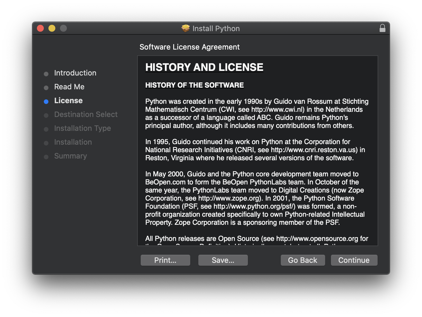 Then click “Continue” again. A new panel will appear with an interesting recap on the history of Python and its governance: