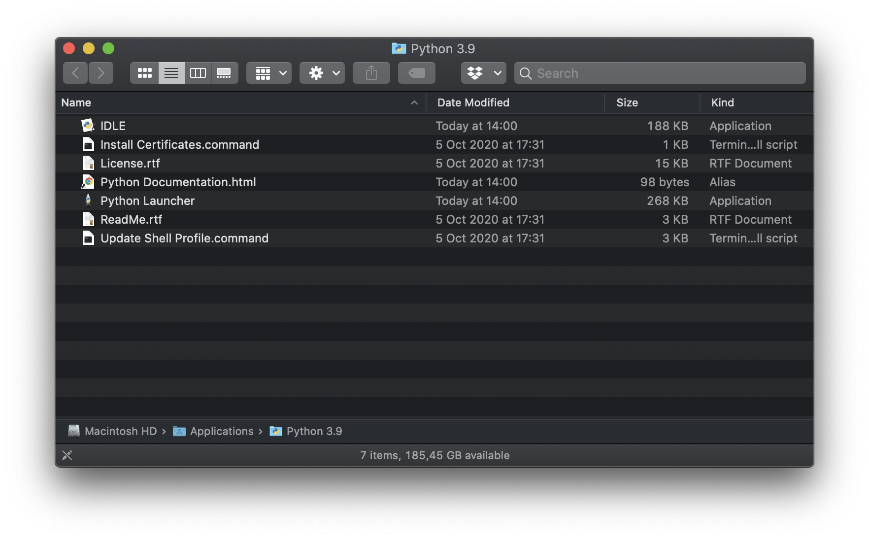 You will now also find a new folder under “/Applications/Python 3.9” (change that with your exact version number), with some files: