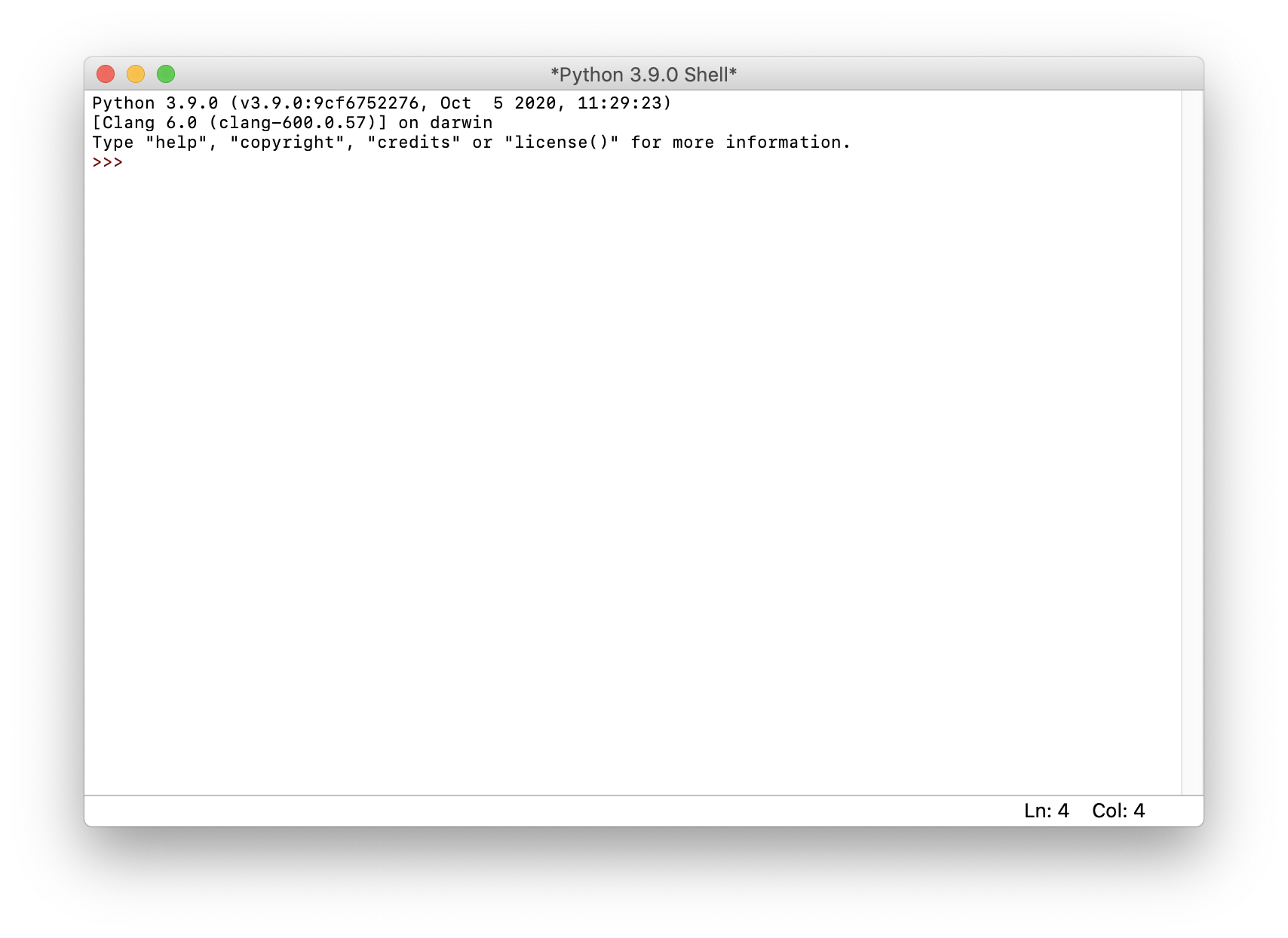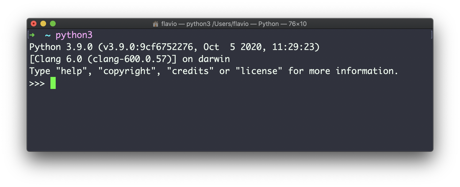 Running python3 in the macOS terminal opens the Python 3.9 interpreter we just installed:
