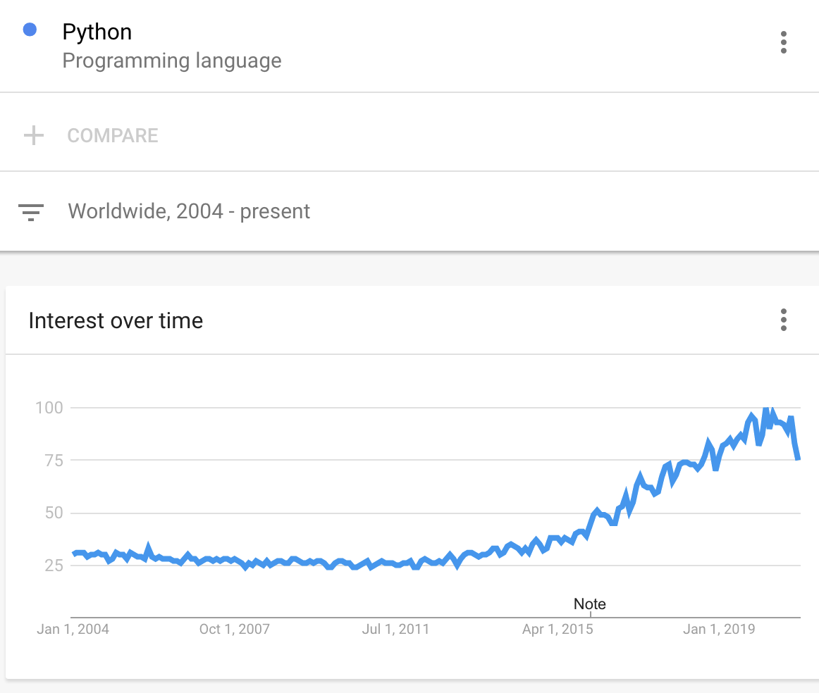Created in 1991 by Guido van Rossum, it’s been rising in popularity - especially in the past 5 years, as this Google Trends infographic shows:
