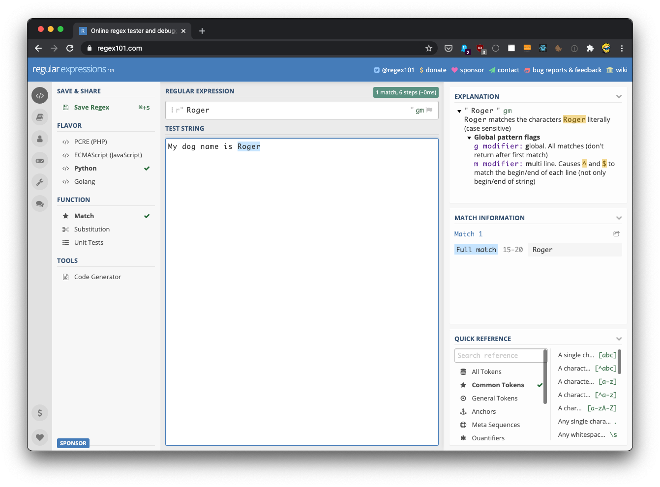 result = re.match('^.*Roger', 'My dog name is Roger')