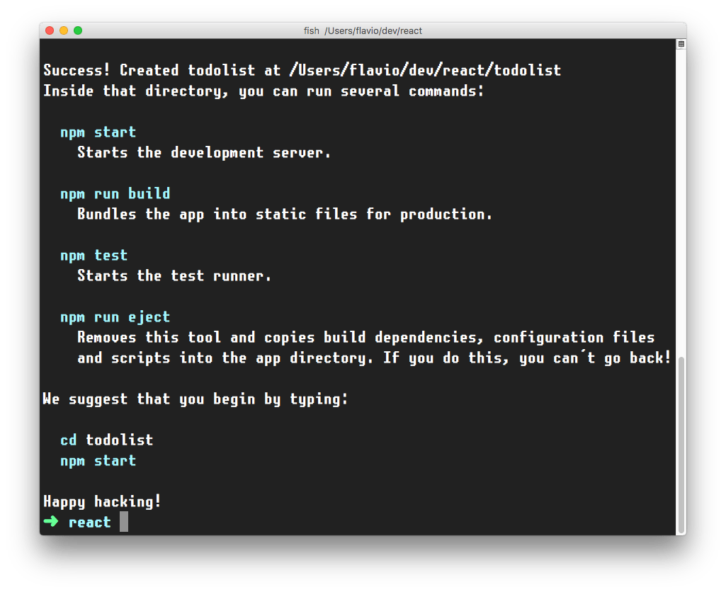 create-react-app created a files structure in the folder you told (todolist in this case), and initialized a Git repository.