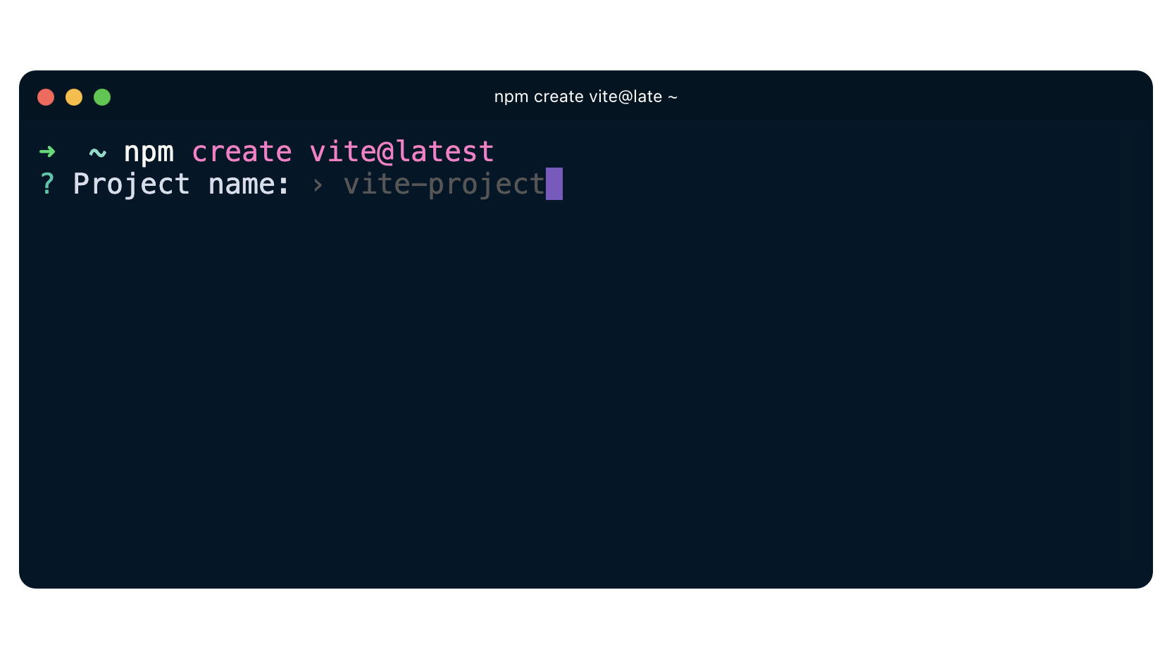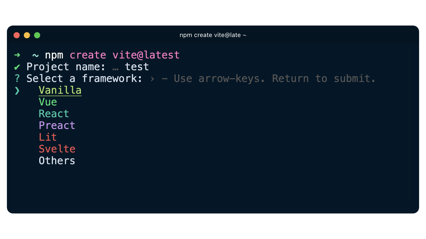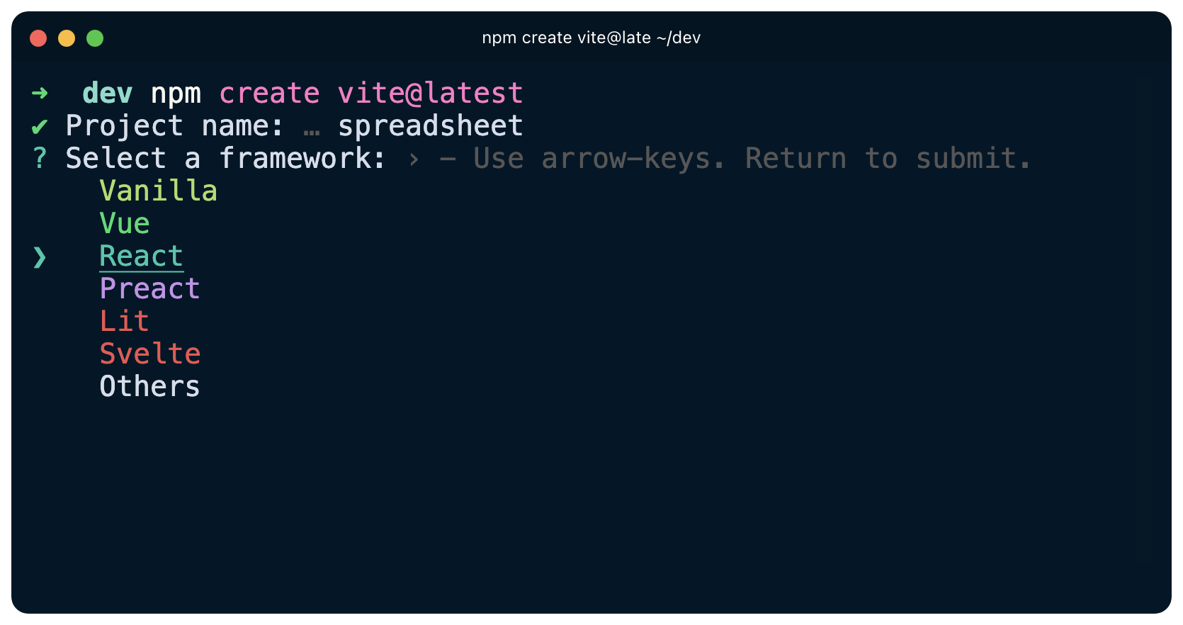 To create a project using Vite you first go into the folder where you host all your projects, in my case a dev folder in my user’s home folder.