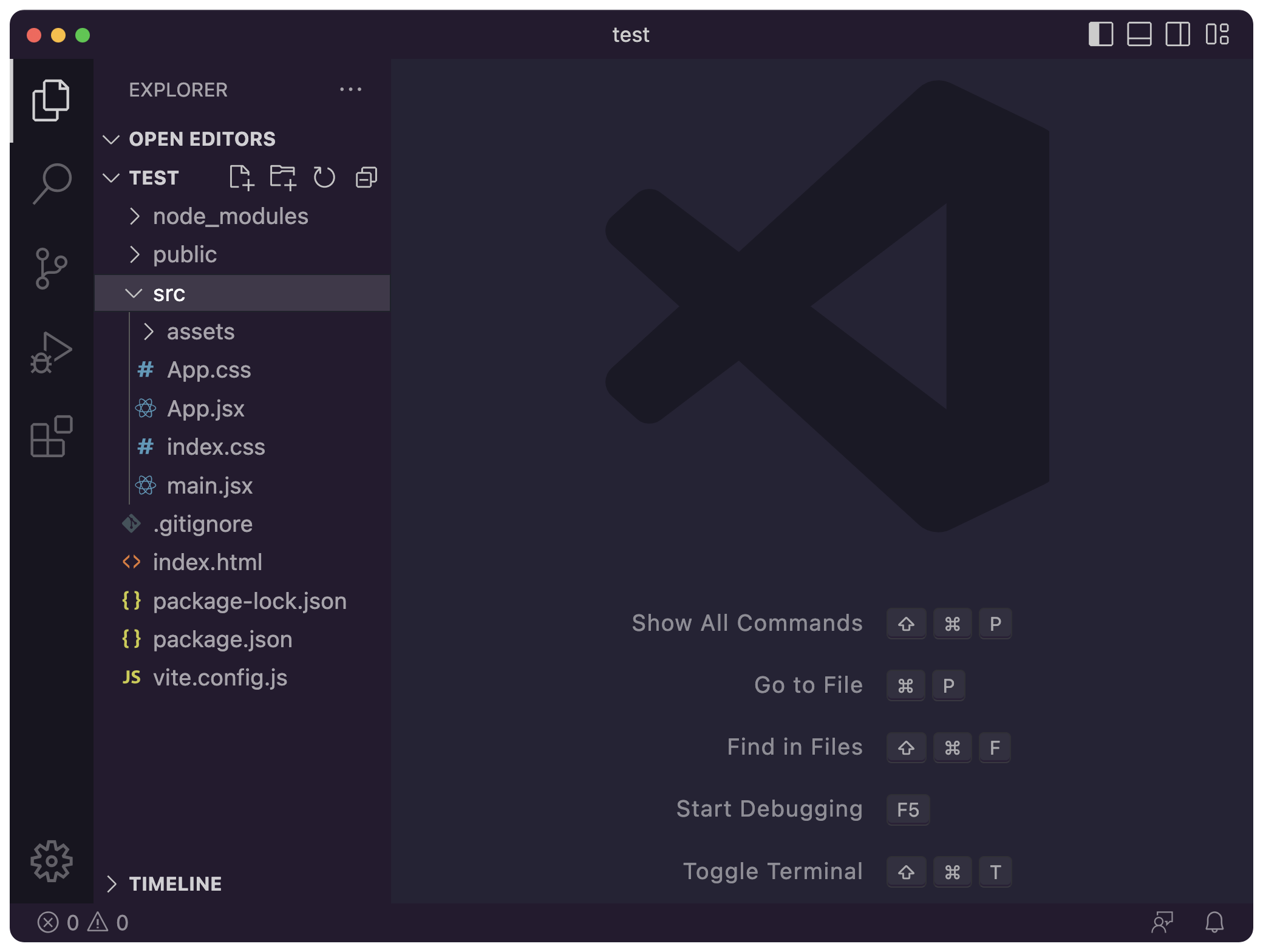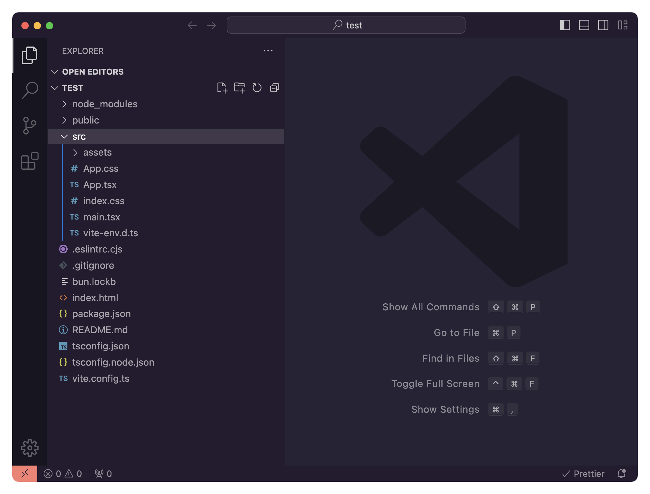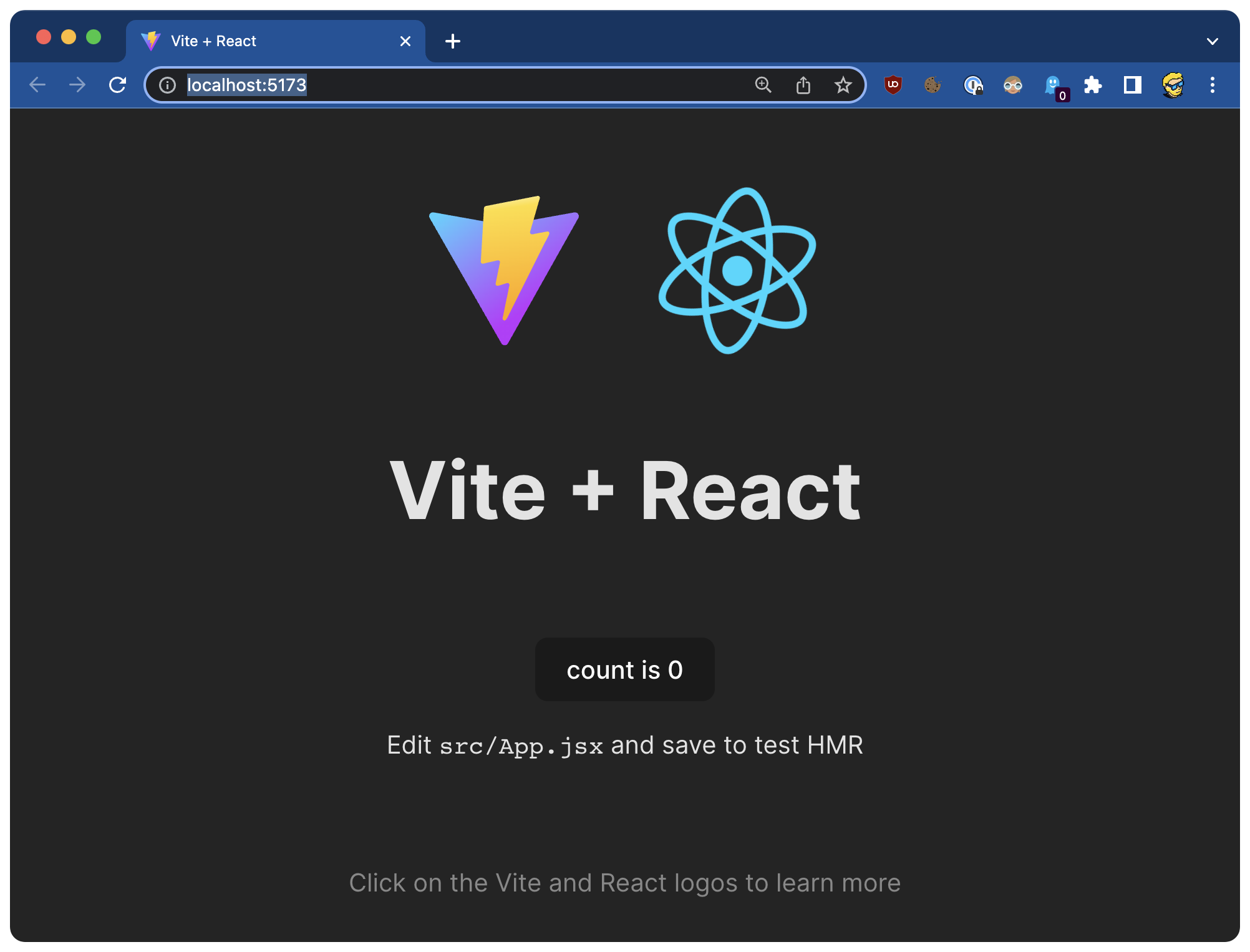 As you can see, Vite created a basic application and you can now open src/App.tsx (TypeScript) or App.jsx to start working on it.