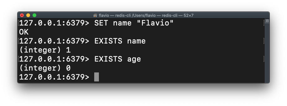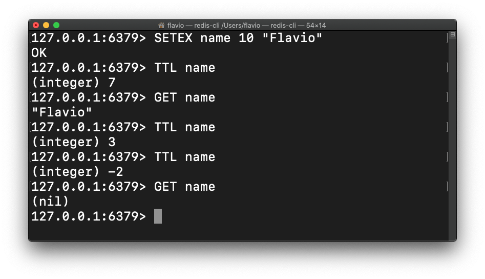 In this example I set a name key with Flavio as value, and using TTL I can check how much time is left until the key will return the value. Once the timer expires, it results in a null value (nil):