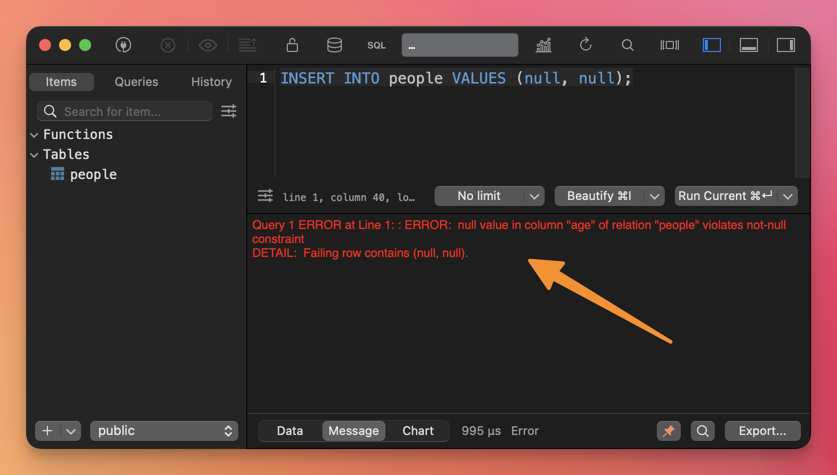 To solve this, we can declare constraints on our table columns. NOT NULL prevents null values: