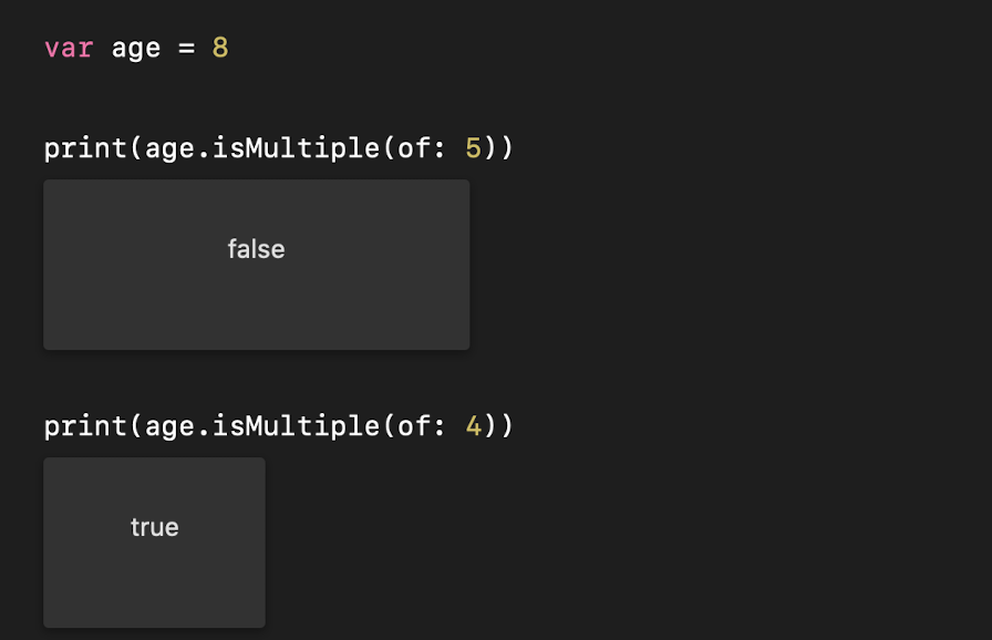 For example, talking about the 8 number value, we can call its isMultiple method, to check if the number is a multiple of another number: