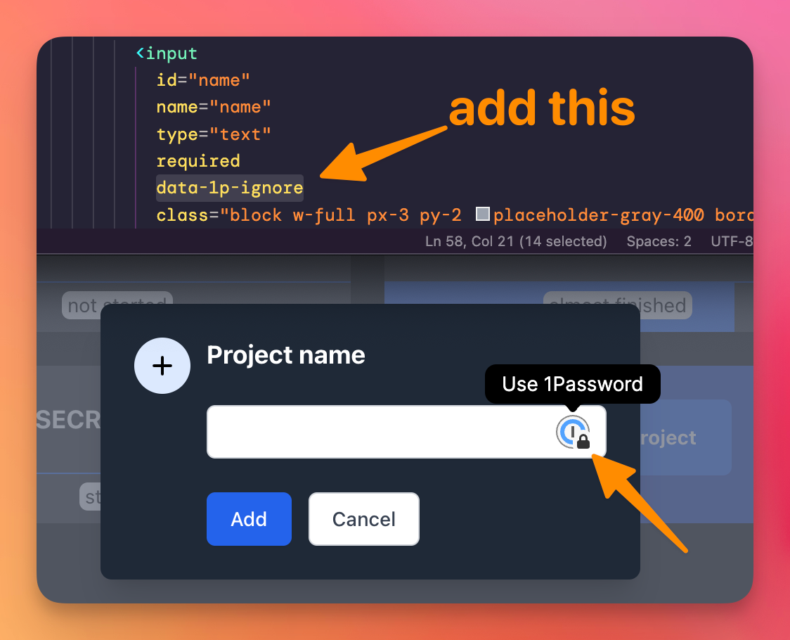 If you can’t, or don’t want, there’s another non-optimal solution, which I tried to remove that icon from my site when working localhost: change the field name and id attributes to project_name, and the 1Password icon goes away.