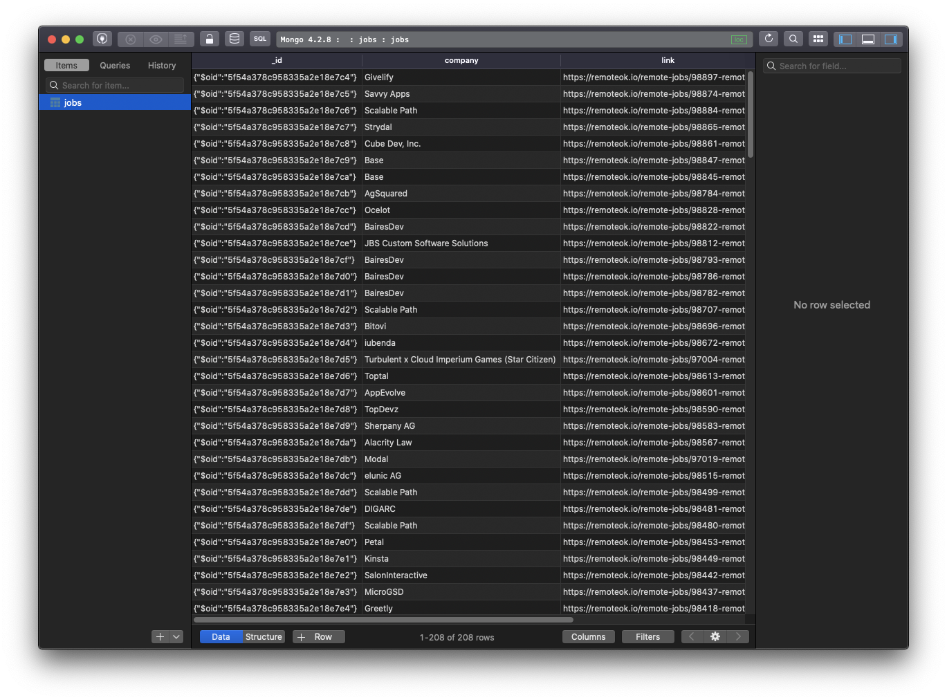 Now if you try running node app.js again, and you inspect the MongoDB database content with the terminal console or an app like TablePlus, you will see the data being present: