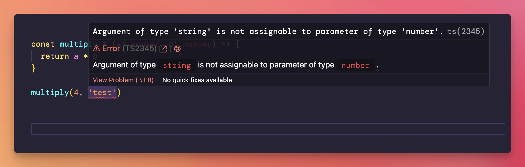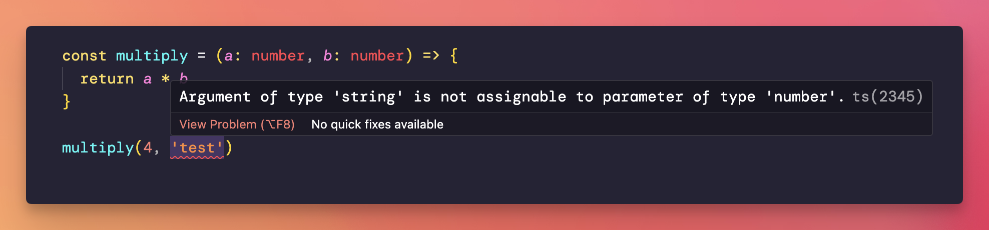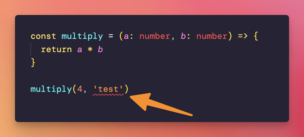 If you pass a string to multiply(), VS Code will show you an error by underlining the problematic part of your code: