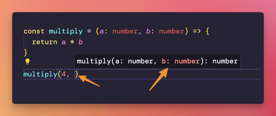 Now try writing multipl( in your editor, you will see VS Code suggests you the types of the function as you type it: