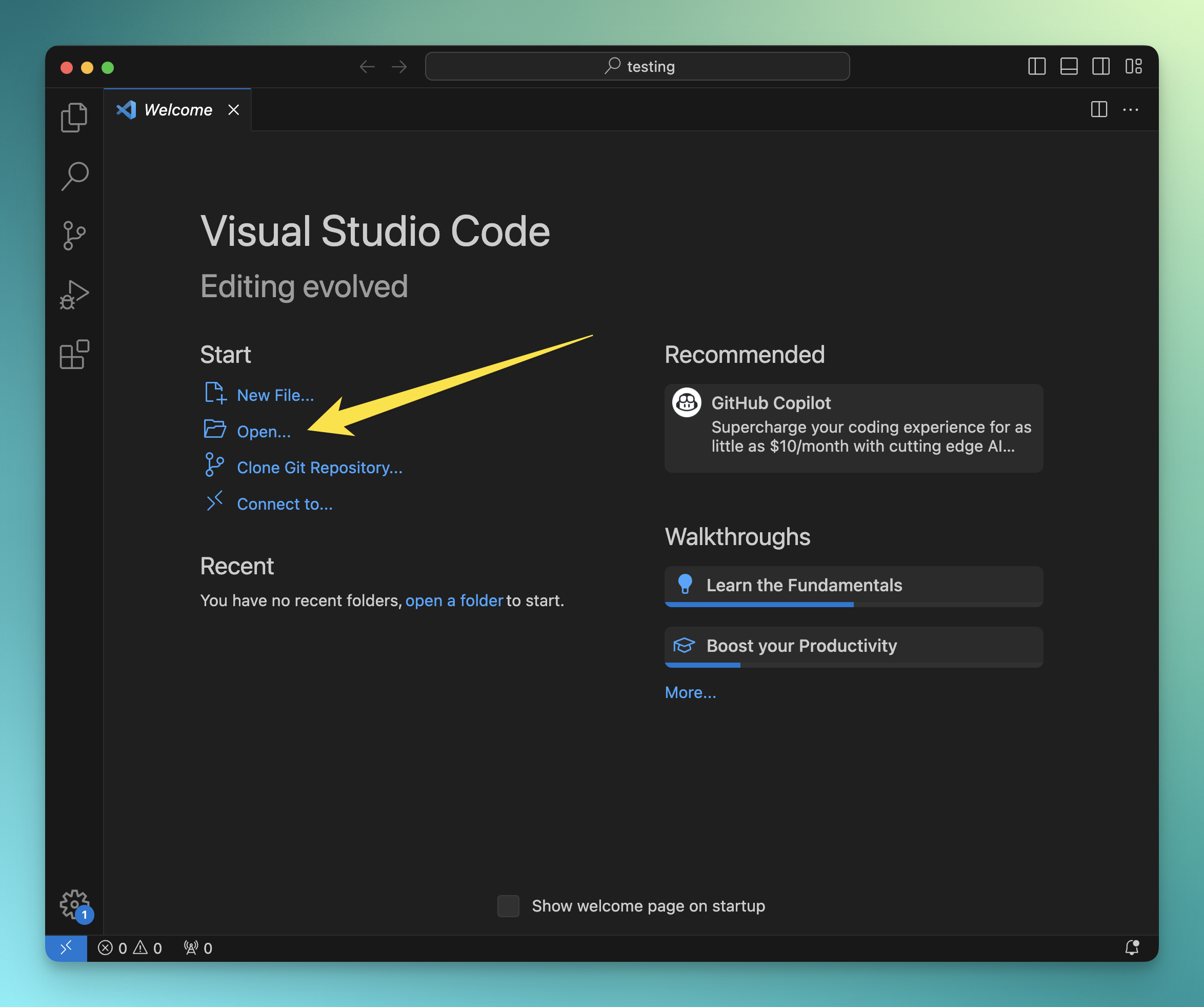 One thing I generally do is: drag a folder I use for my project into VS Code itself, dragging the folder icon into the VS Code window.